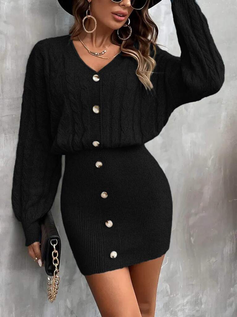 Kadın Uzun Kollu V Yakalı önden Düğmeli Kısa Triko Elbise