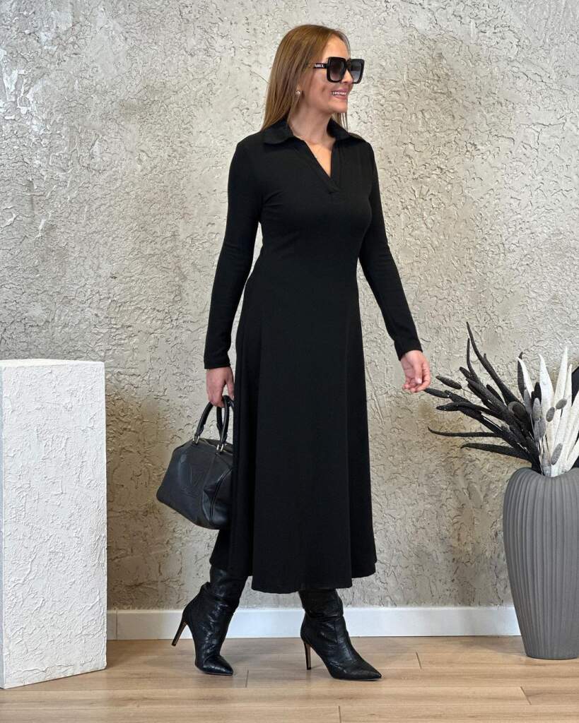Kadın Uzun Kollu Yakalı Midi Viskon Iki Iplik Elbise