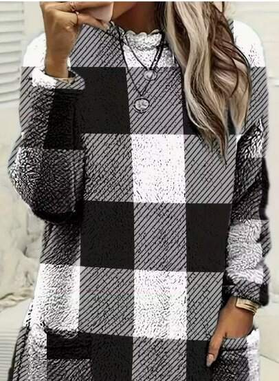 Kadın Uzun Kollu Yarı Balıkçı Yakalı Cep Detaylı Ekoseli Dokuma Tunik