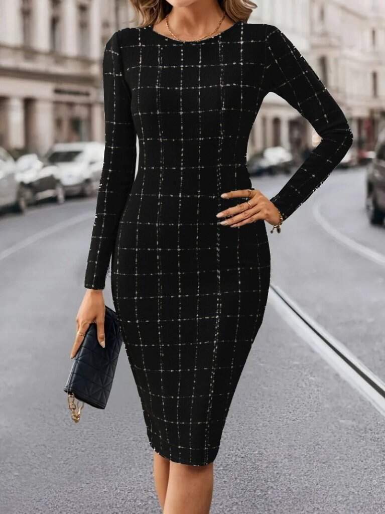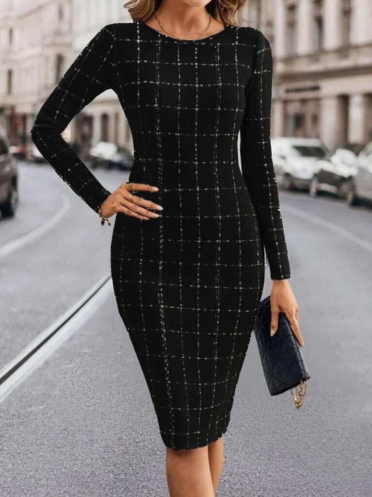 Kadın Uzun Kollu Yuvarlak Yaka Mini Dokuma Elbise