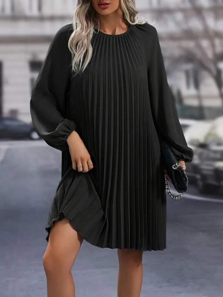 Kadın Uzun Kollu Yuvarlak Yaka Pileli Salaş Mini Ithal Krep Elbise