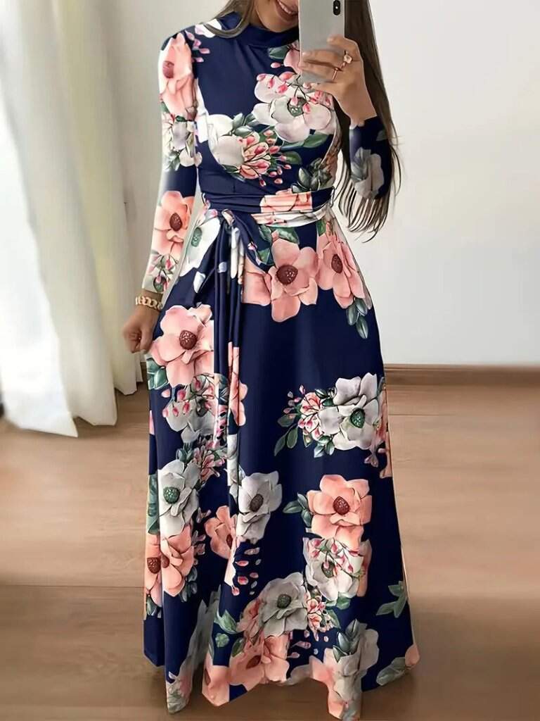 Kadın Uzun Kollu Yuvarlak Yakalı Beli Kuşaklı Desenli Süprem Uzun Elbise