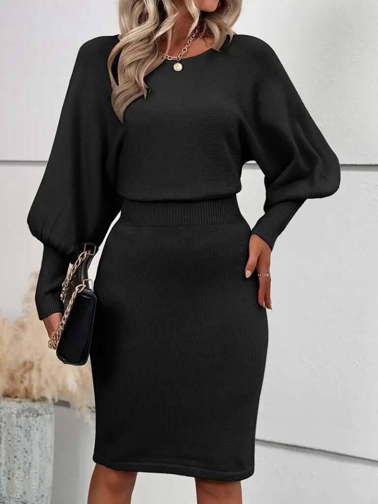 Kadın Uzun Yarasa Kollu Yakası Açık Belden Oturtmalı Kısa Triko Elbise