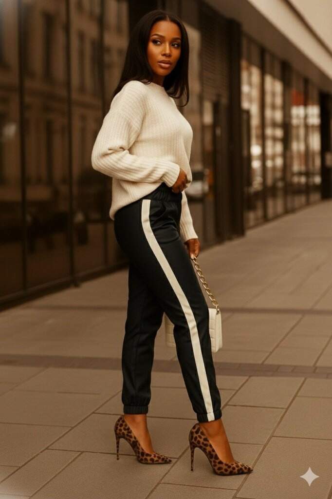 Kadın Yüksek Bel Lastikli Yan şerit Detaylı Deri Pantolon