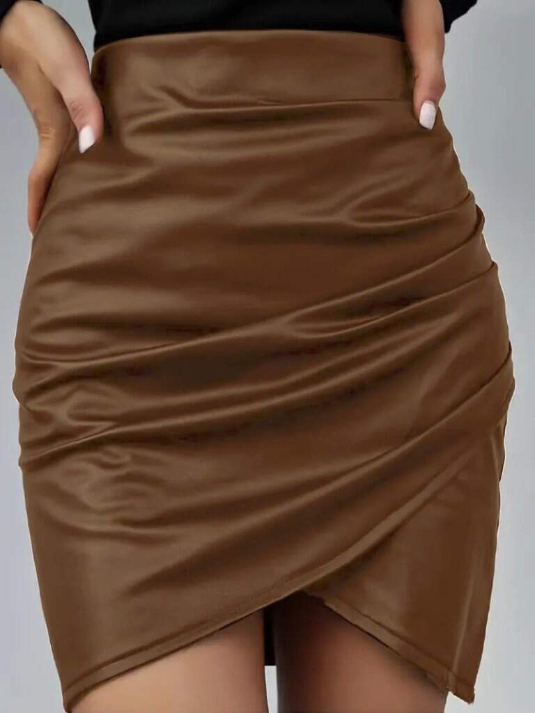 Kadın Yüksek Bel Yandan Fermuarlı Pileli Mini Deri Etek
