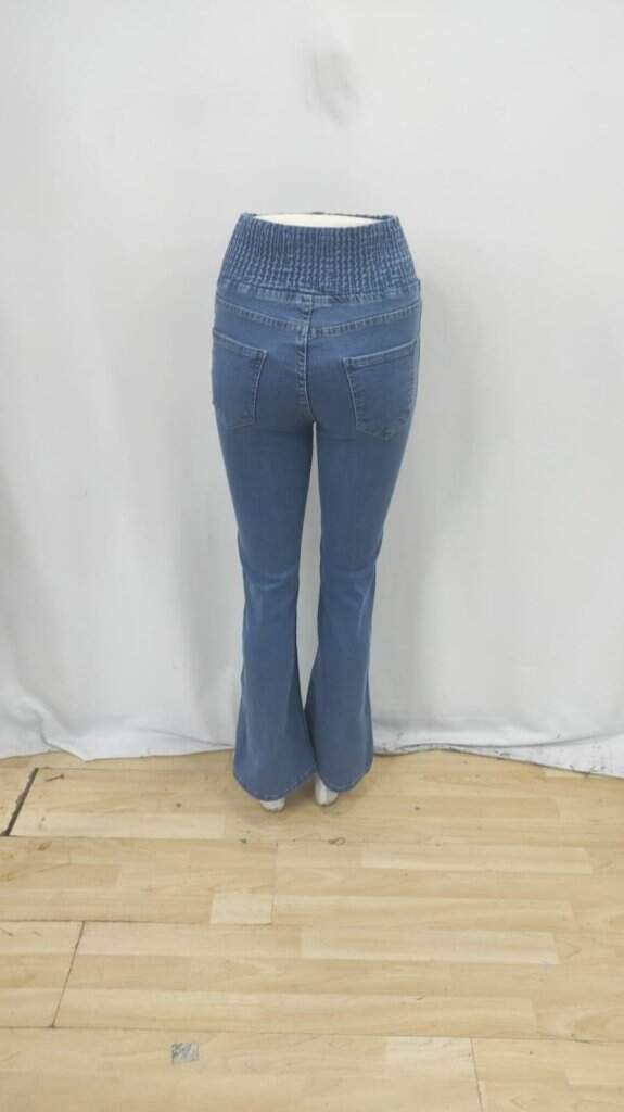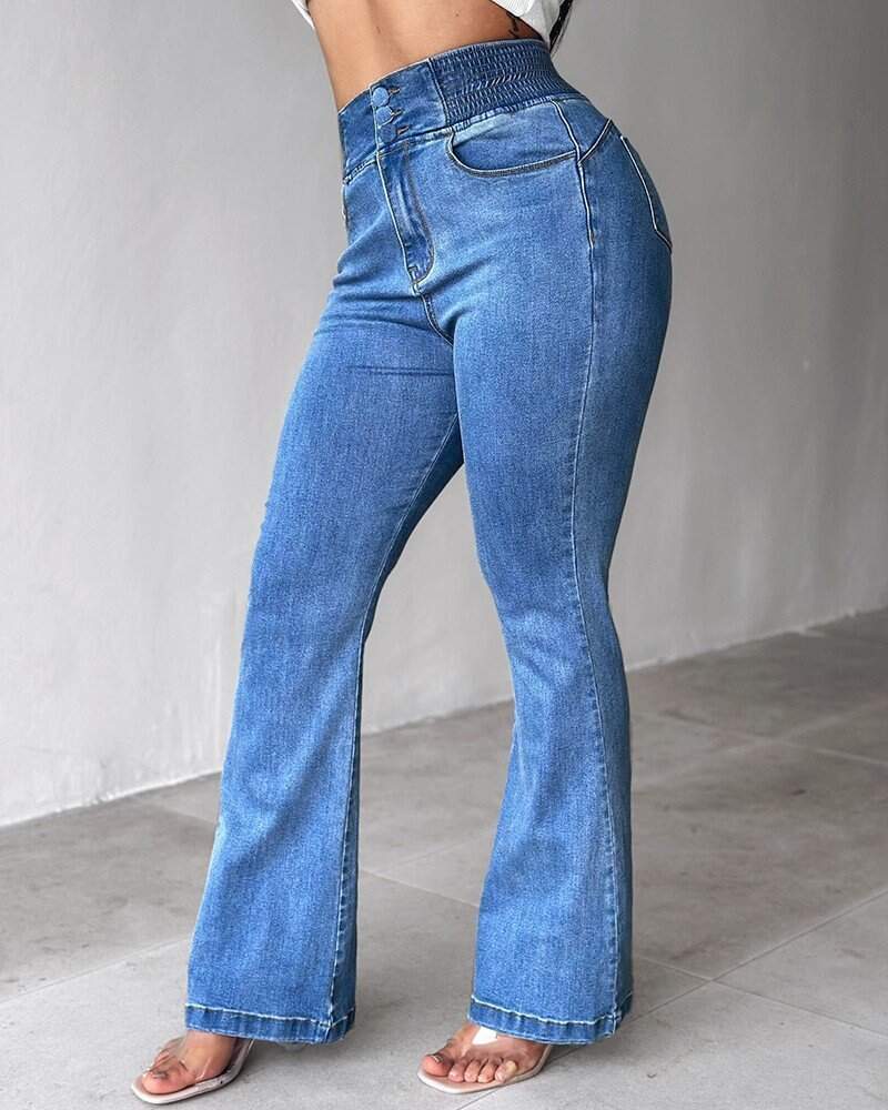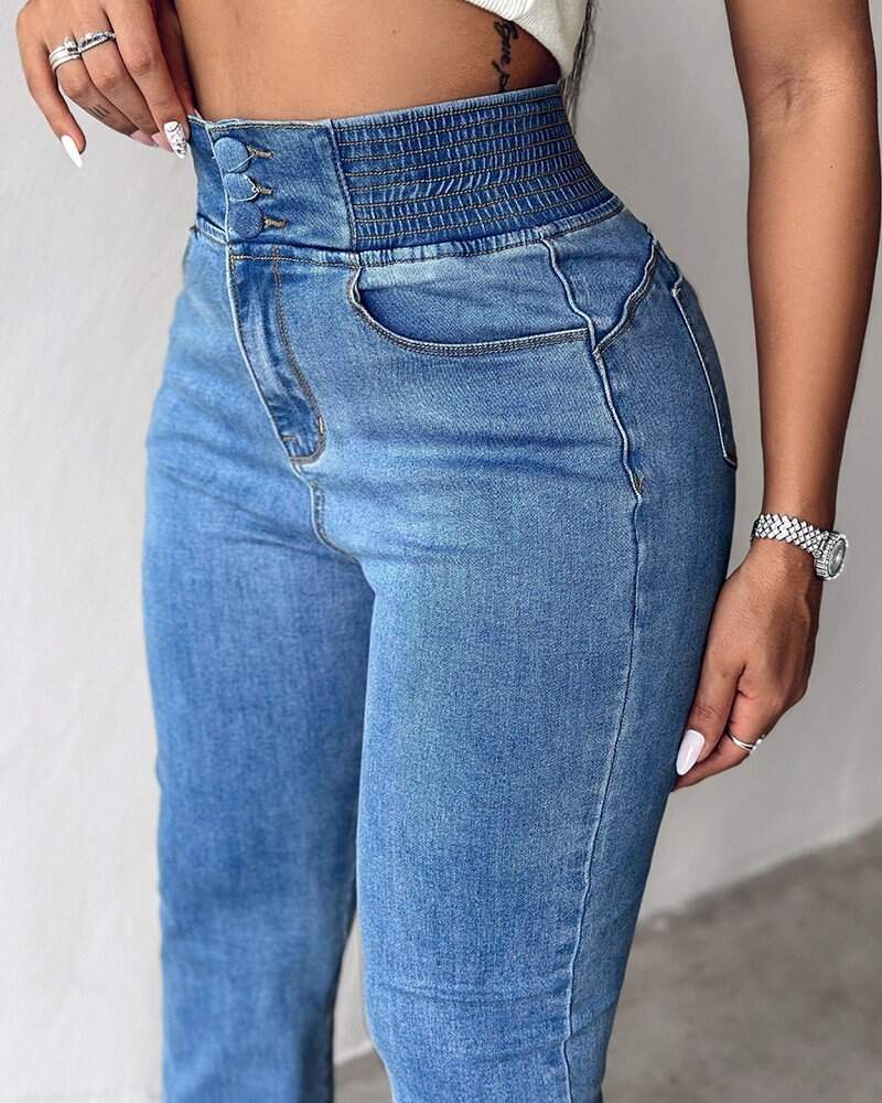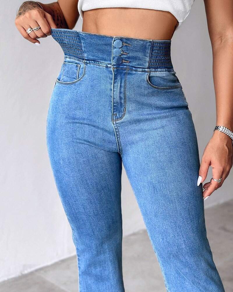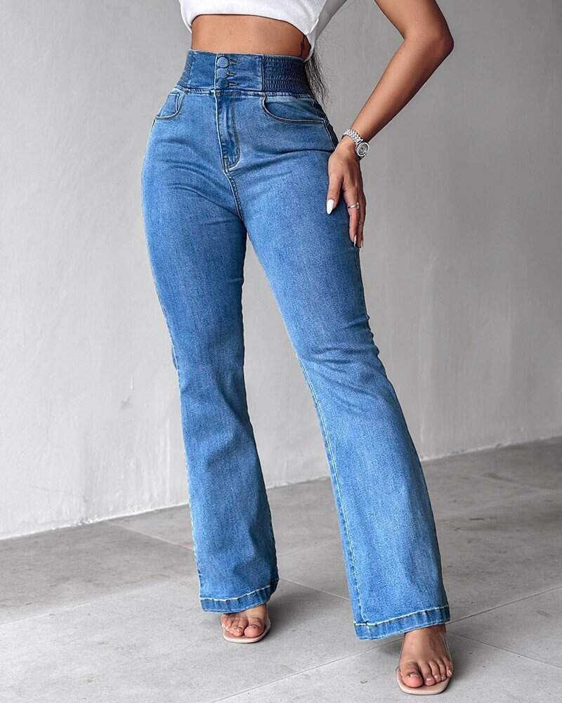 Kadın Yüksek Bel Yanları Lastik önü Düğmeli Kot Pantolon