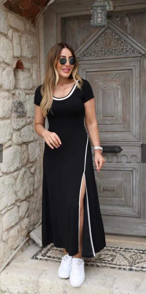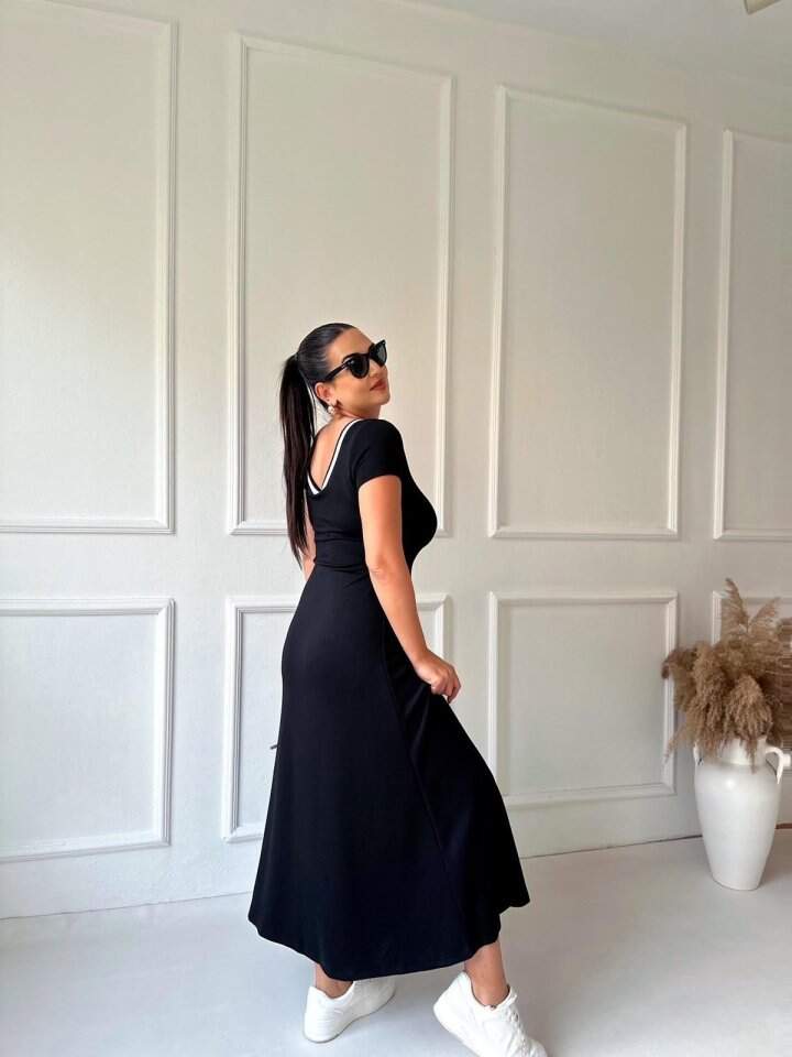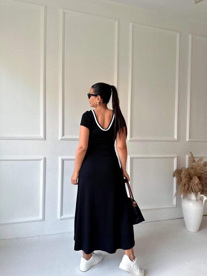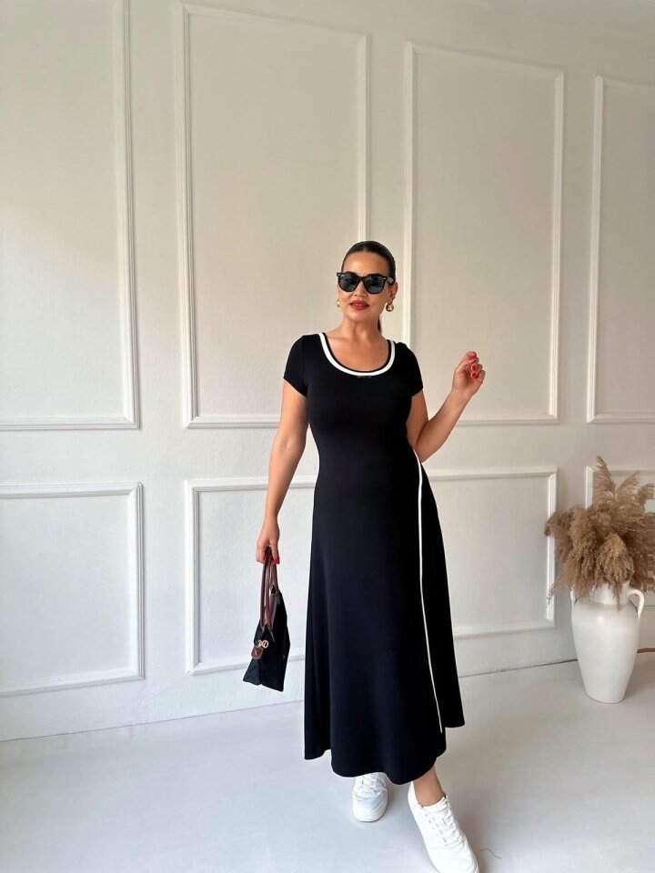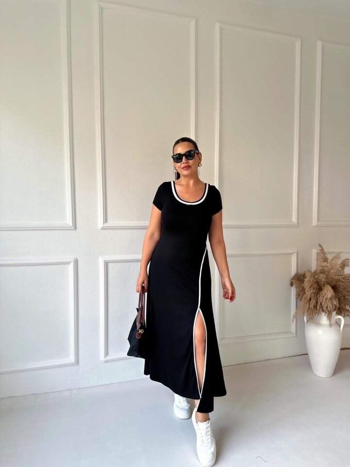 Kadın Yuvarlak Ribana Yaka Beyaz Yırtmaç Detaylı Viskon Tam Boy Elbise