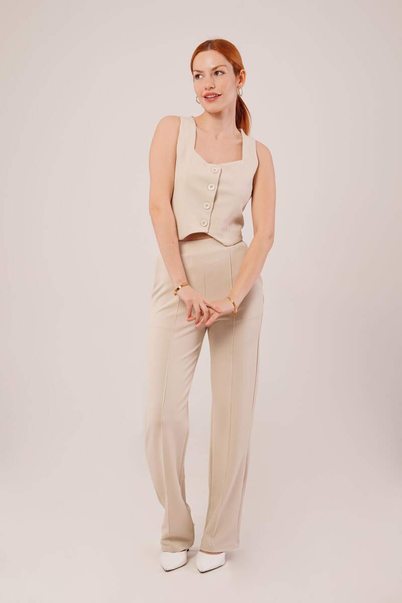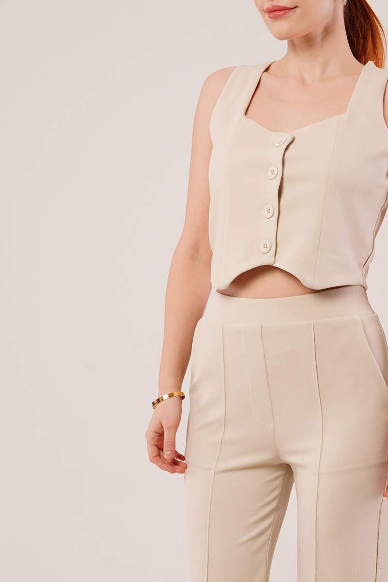 Kalın Askılı Düğmeli Yelek Ve Pantolon Bej Takım