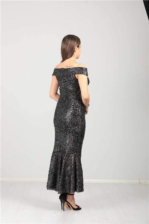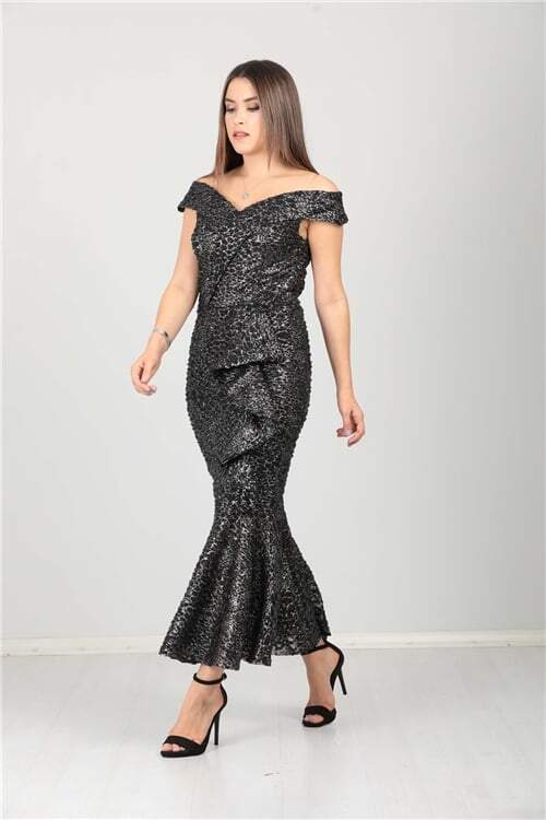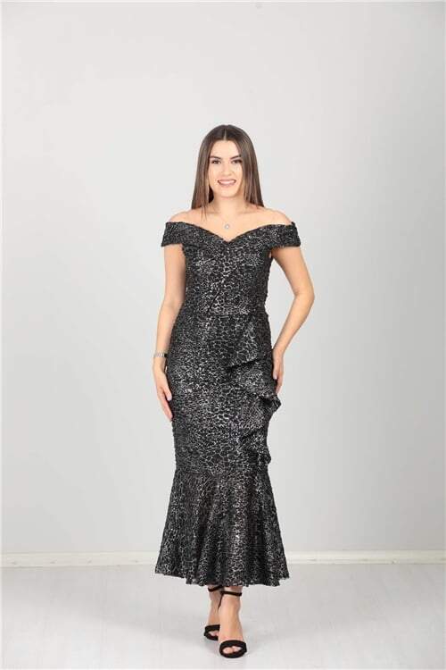 Kayık Yaka Eteği Volanlı Fırfır Detaylı Payet Elbise - Siyah