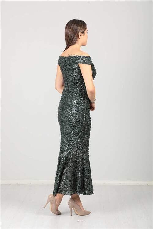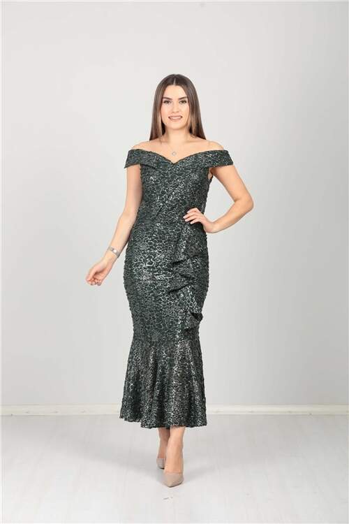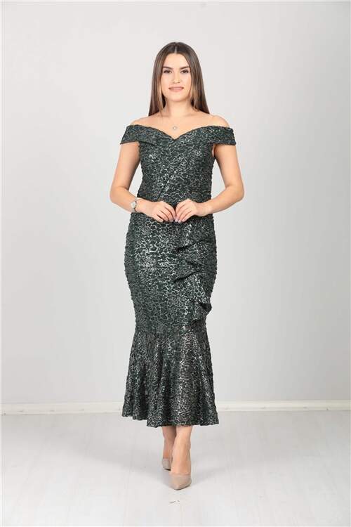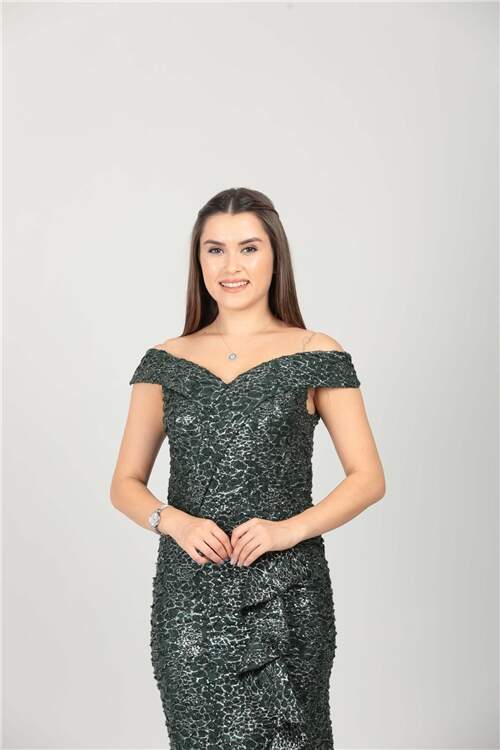 Kayık Yaka Eteği Volanlı Fırfır Detaylı Payet Elbise - Zümrüt