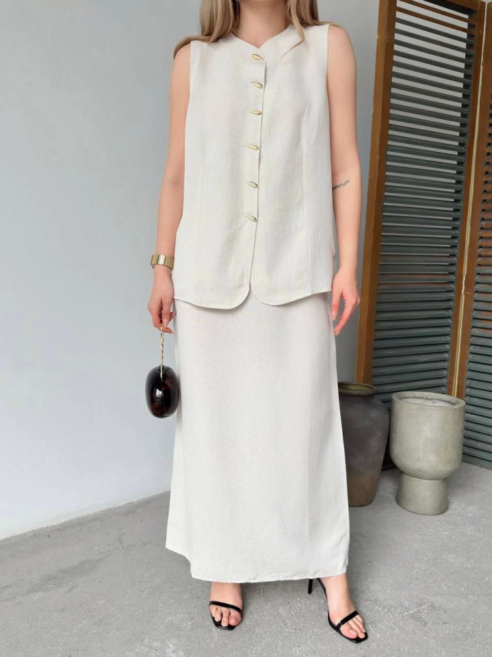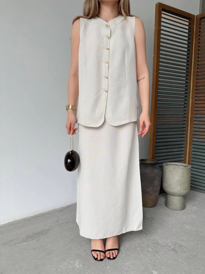 Keten Kolsuz Hırka Etek Ikili Takım- Beyaz