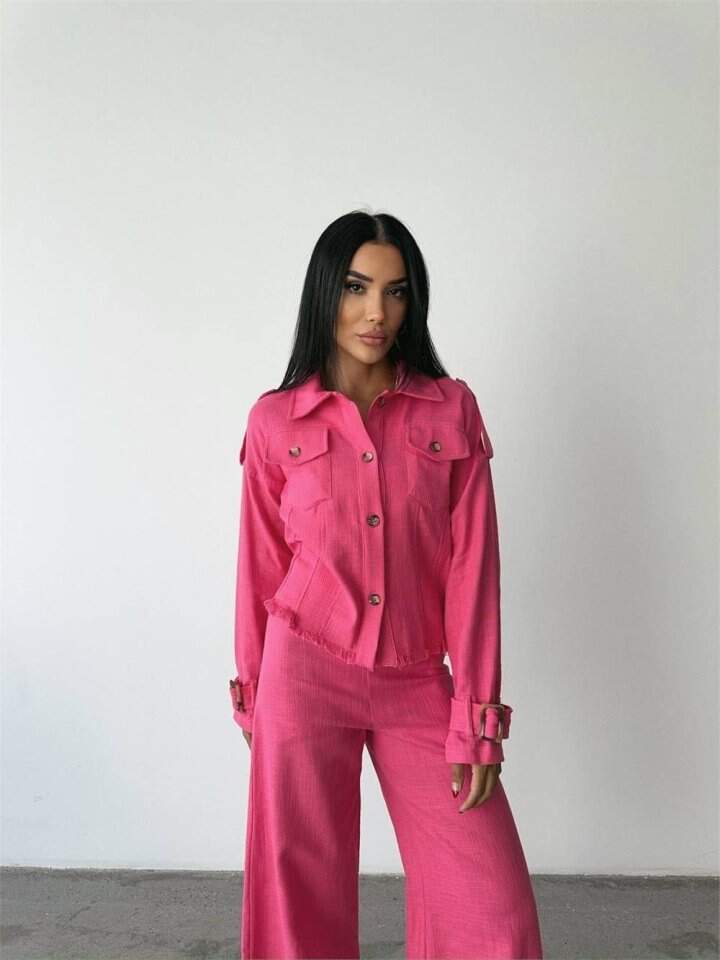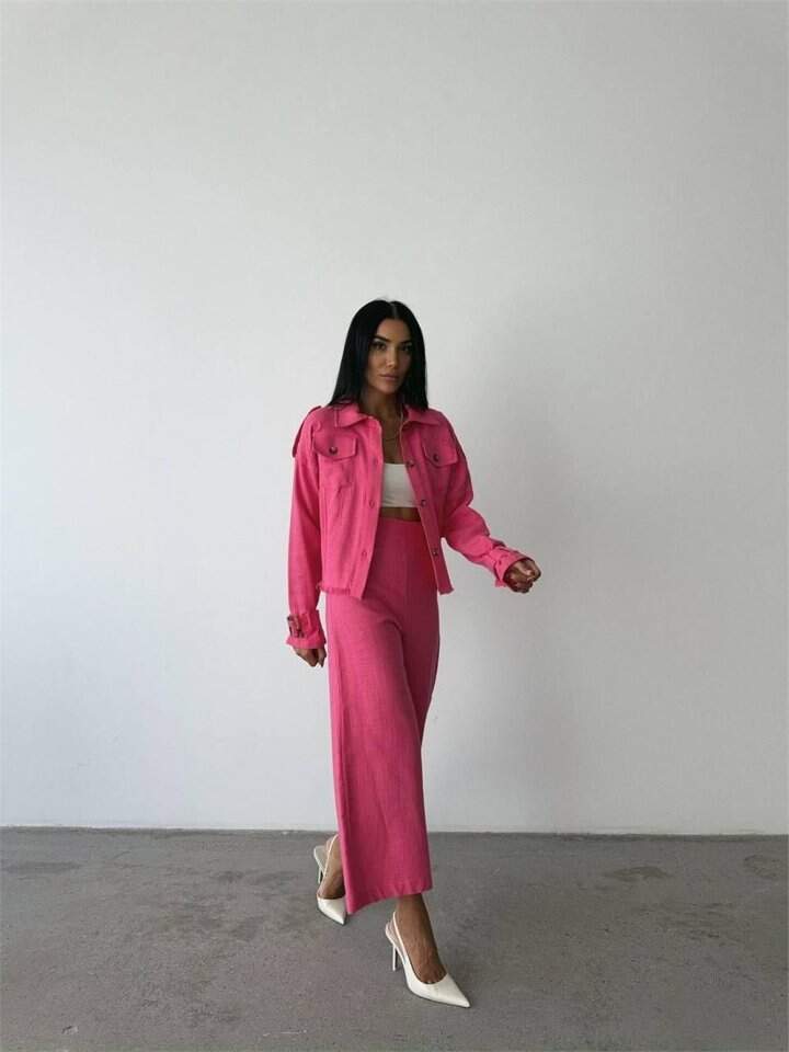 KETEN PÜSKÜL DETAYLI GÖMLEK-PANTOLON TAKIM - Fuşya