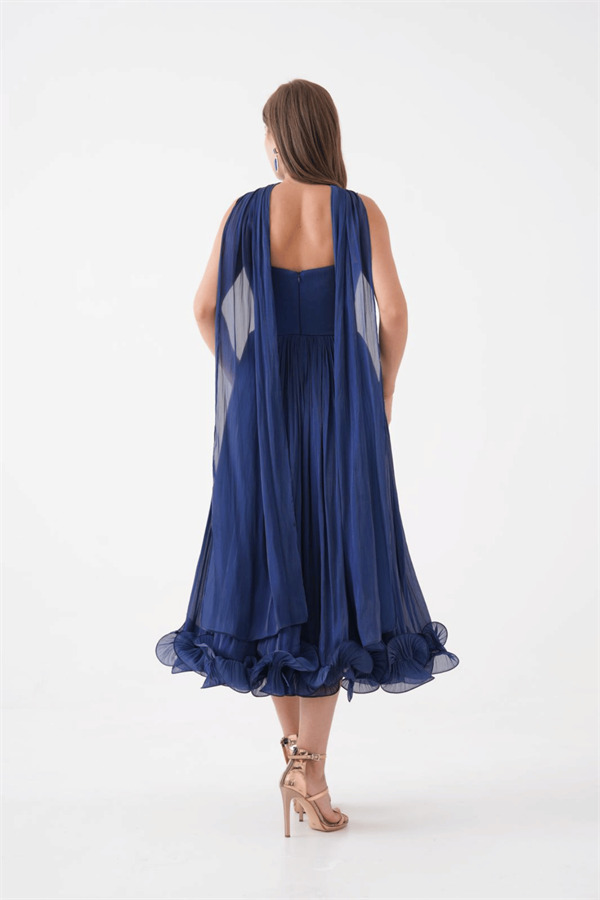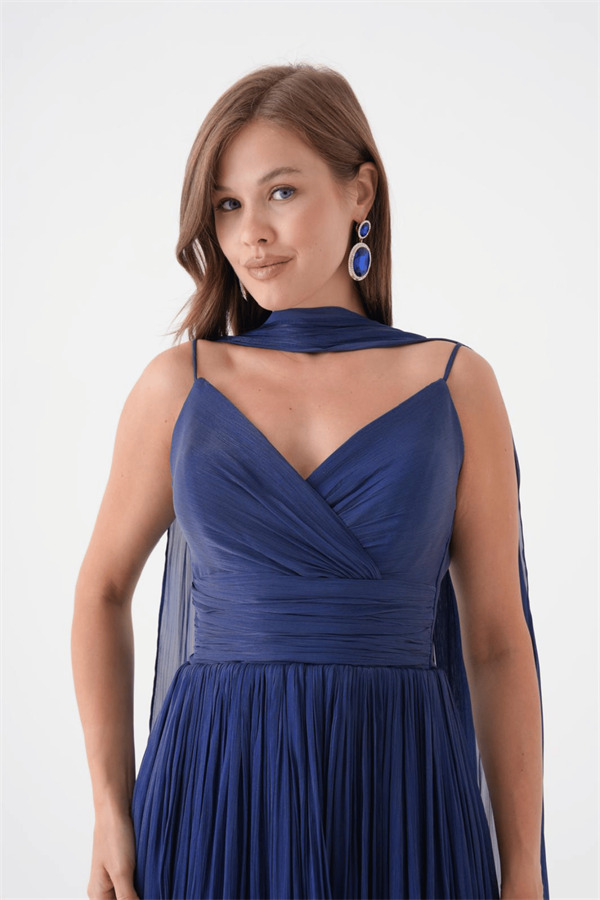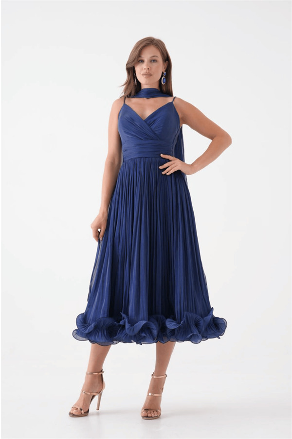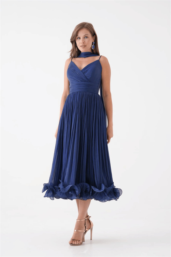 Kırinkıl Saten Kumaş Askılı Midi Boy Elbise - LACİVERT