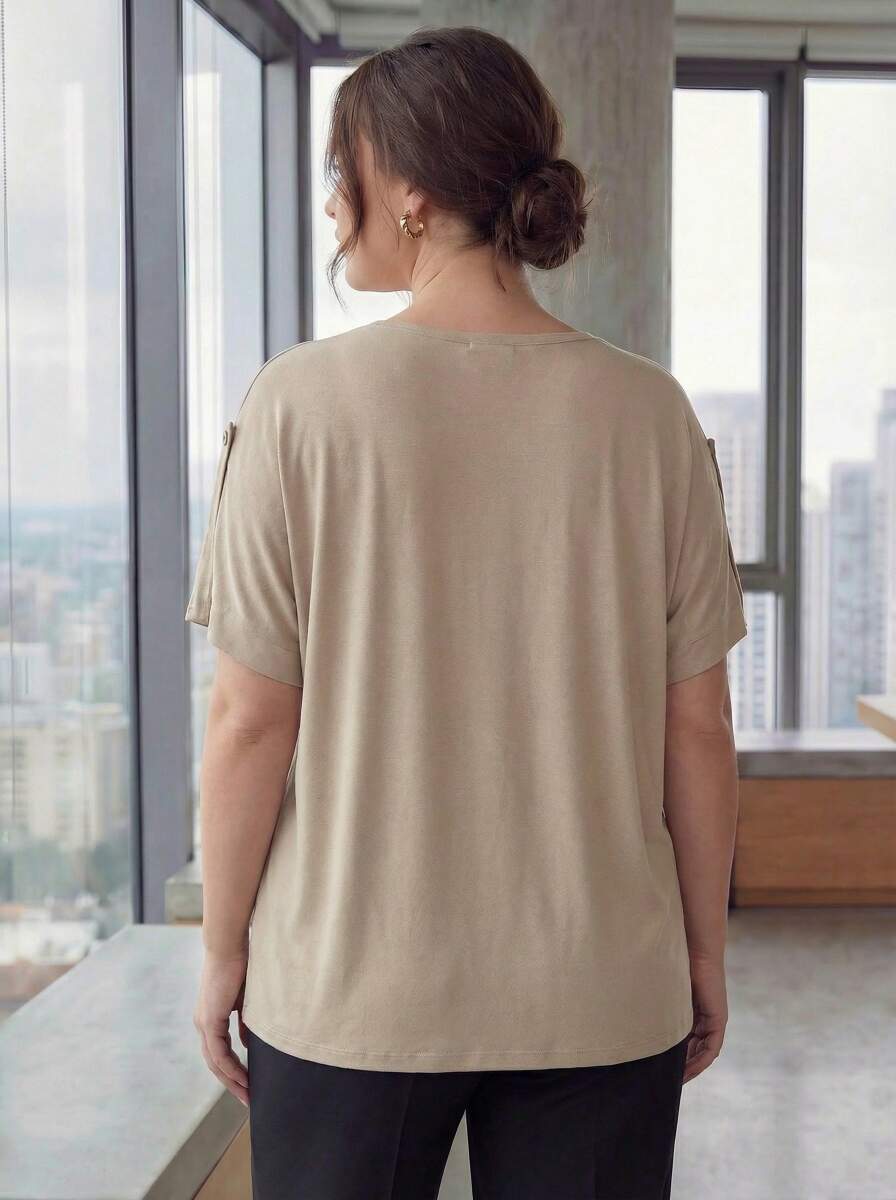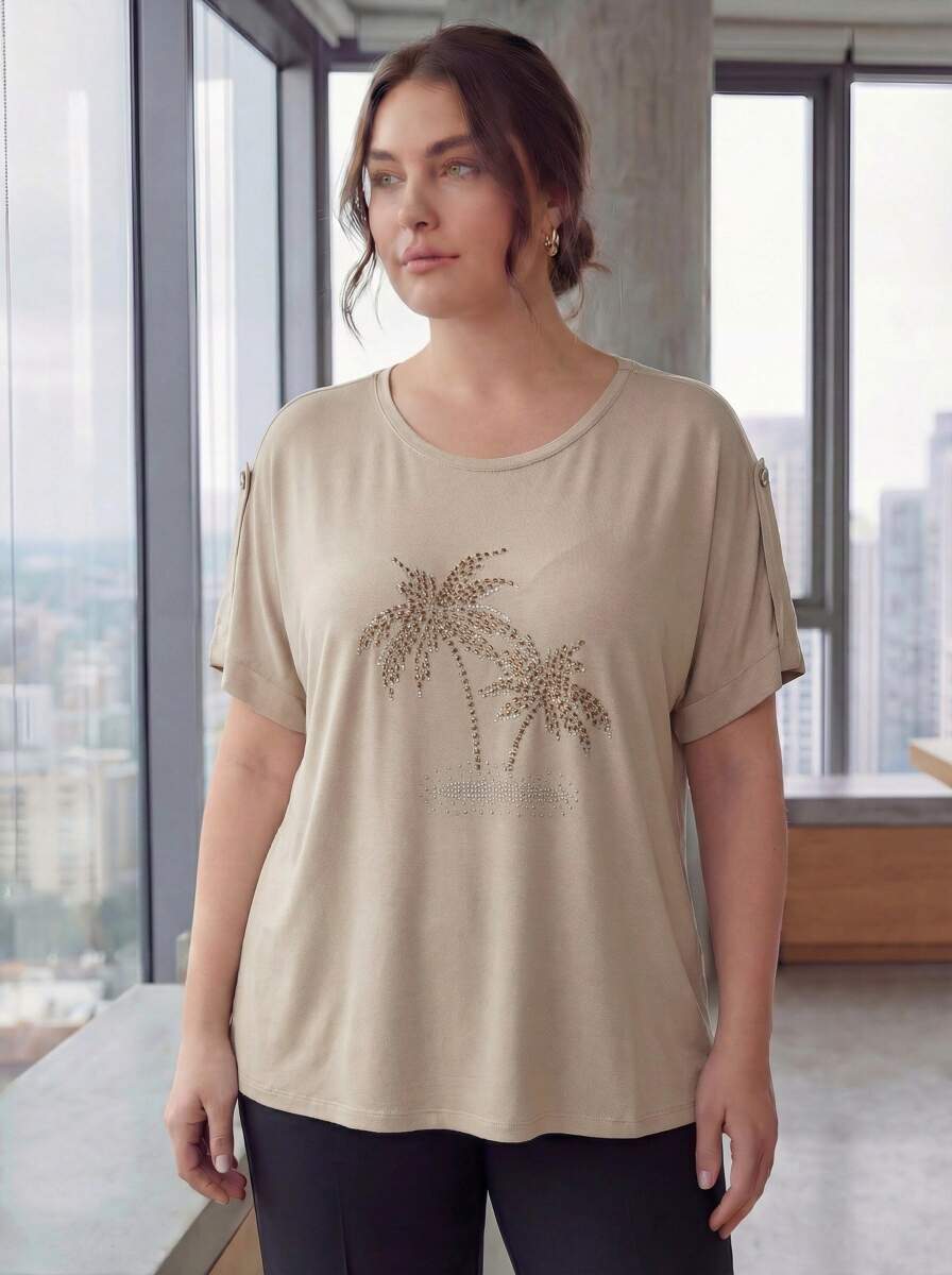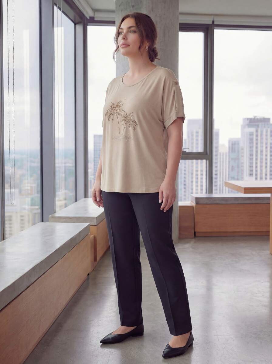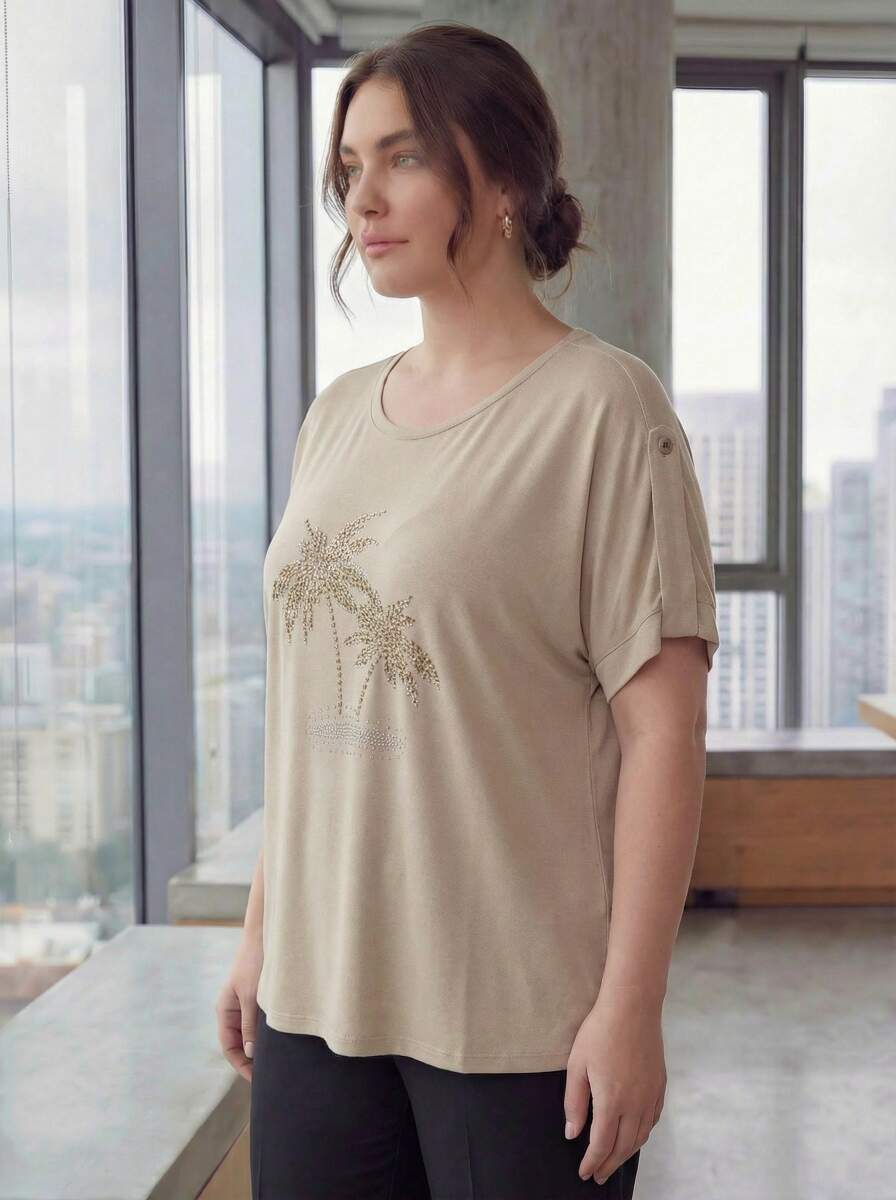 Kol Detaylı Taş Baskılı Büyük Beden Tişört Bej
