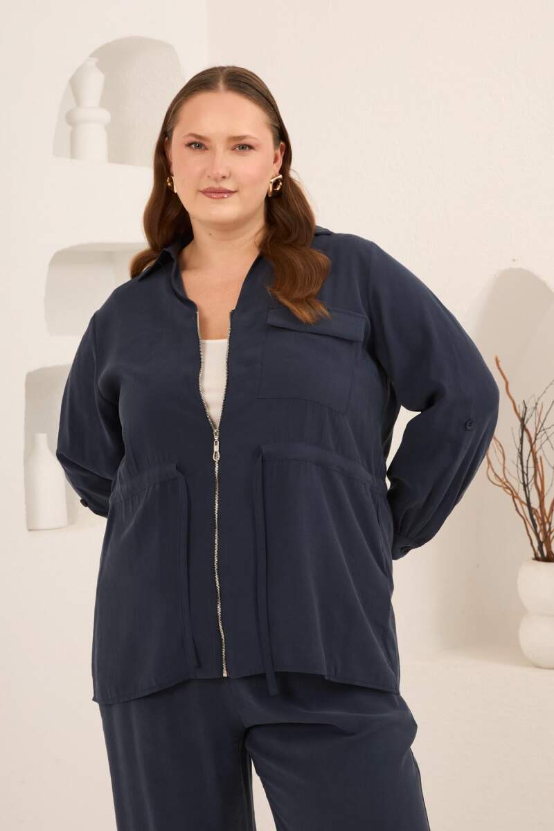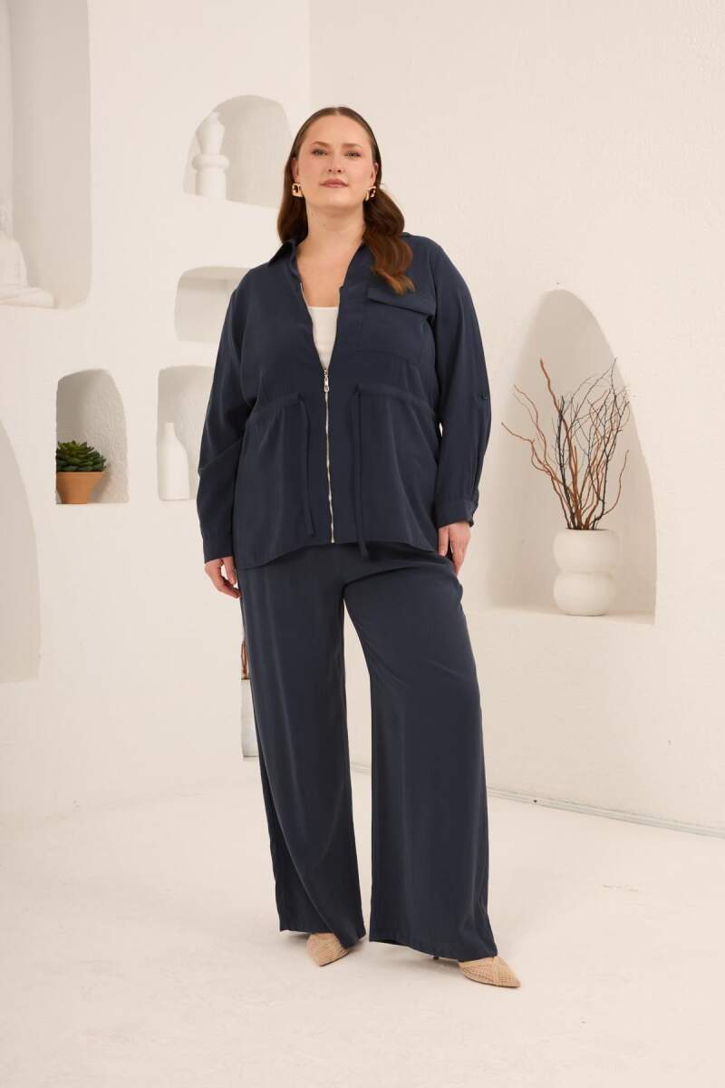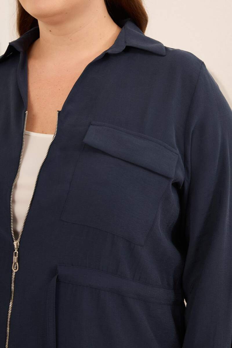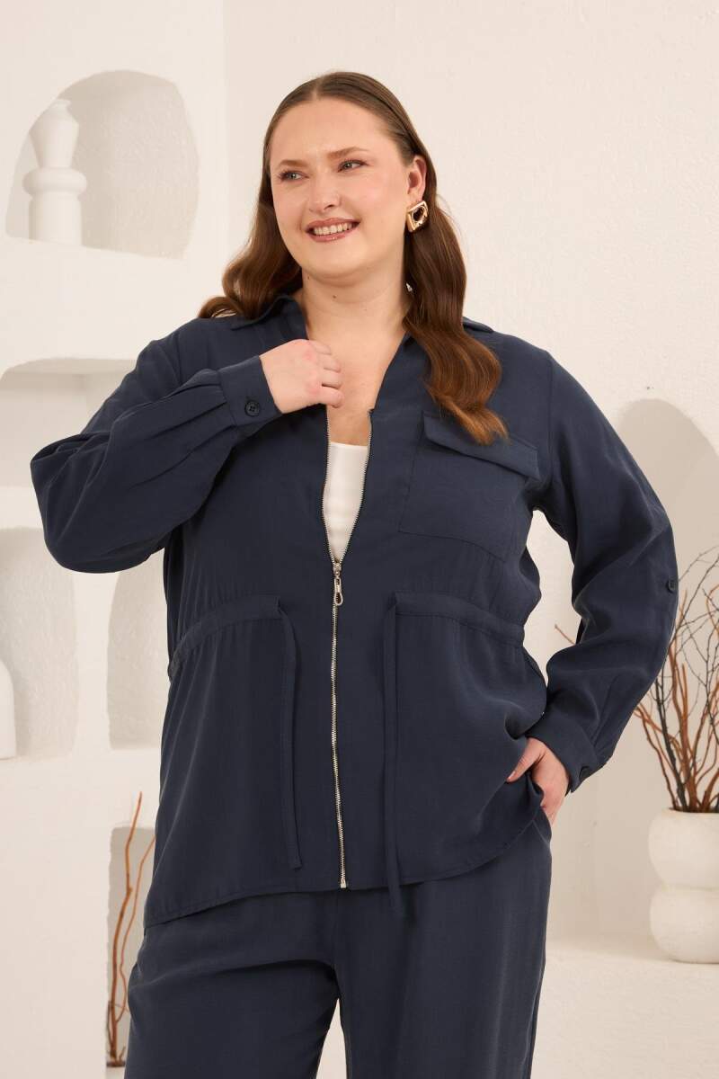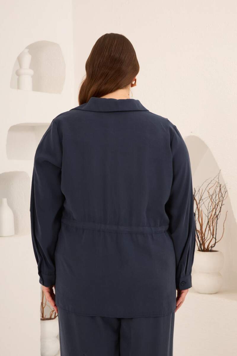 Kolları Piliseli Bel Bağcık Detaylı Kadın Büyük Beden Ceket Lacivert