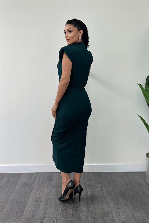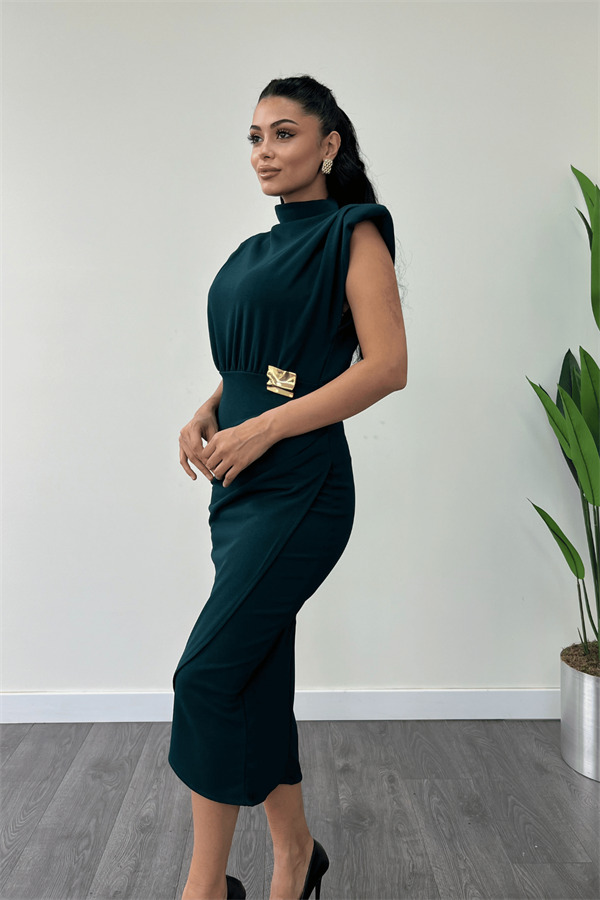 Krep Kumaş Broş Büzgü Detaylı Kalem Elbise - ZÜMRÜT YEŞİL