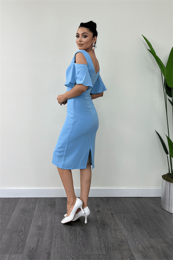 Krep Kumaş Büzgü Detaylı Kalem Elbise - BEBE MAVİSİ