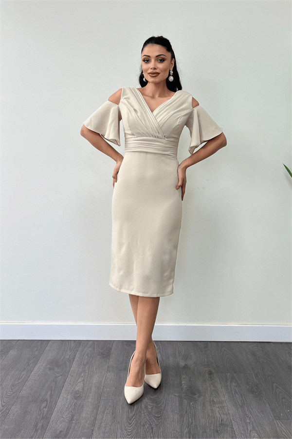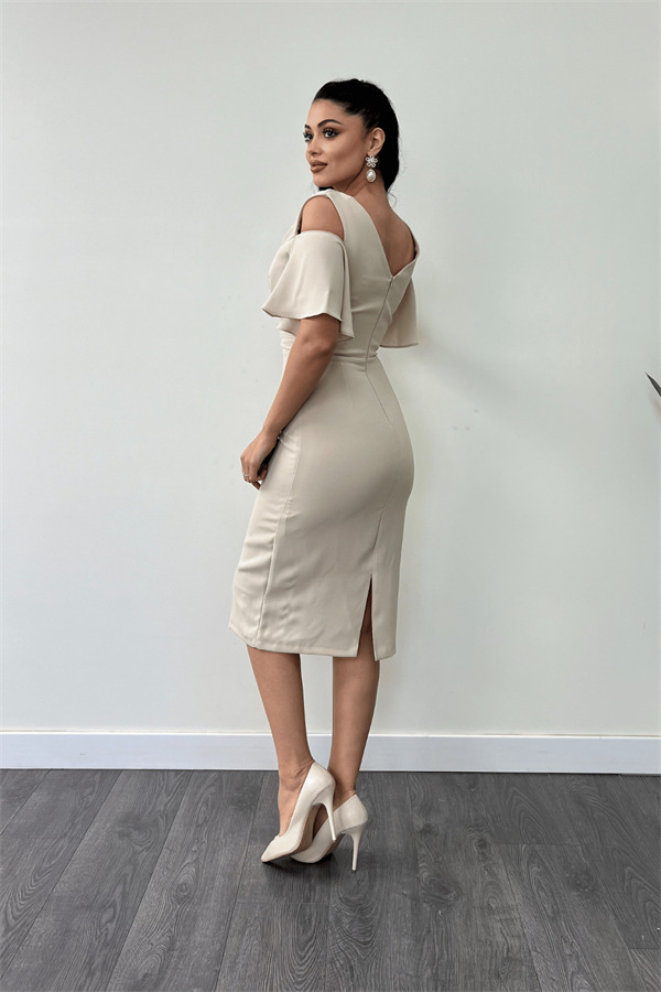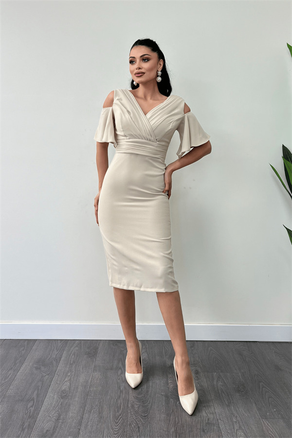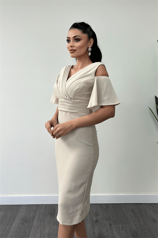 Krep Kumaş Büzgü Detaylı Kalem Elbise - BEJ