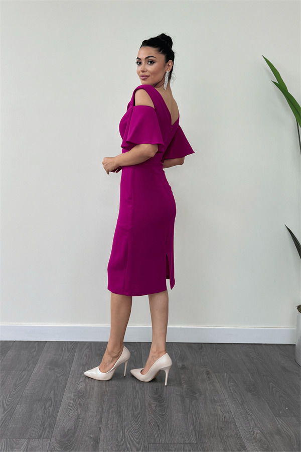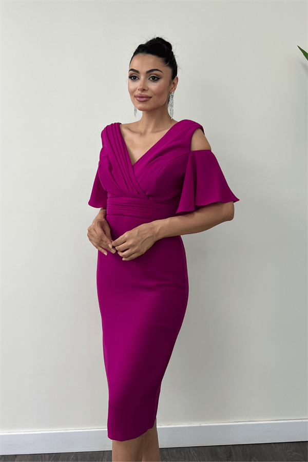 Krep Kumaş Büzgü Detaylı Kalem Elbise - FUŞYA