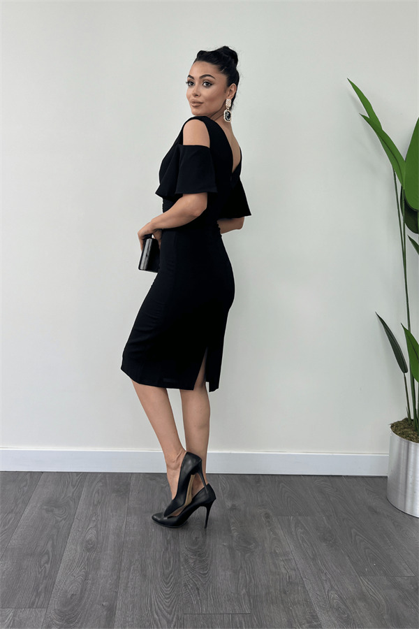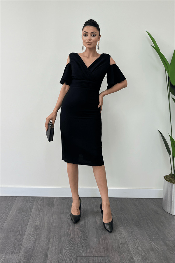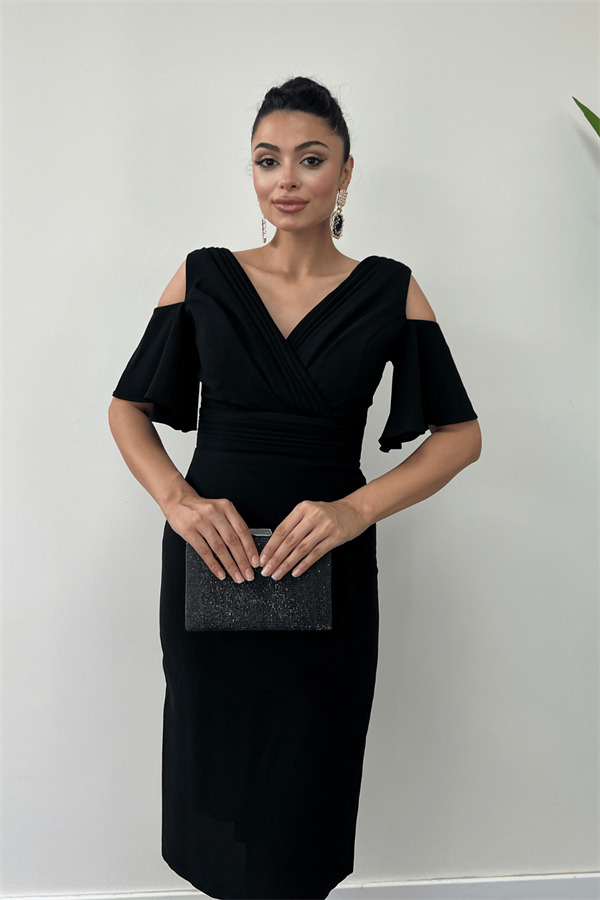 Krep Kumaş Büzgü Detaylı Kalem Elbise - SİYAH