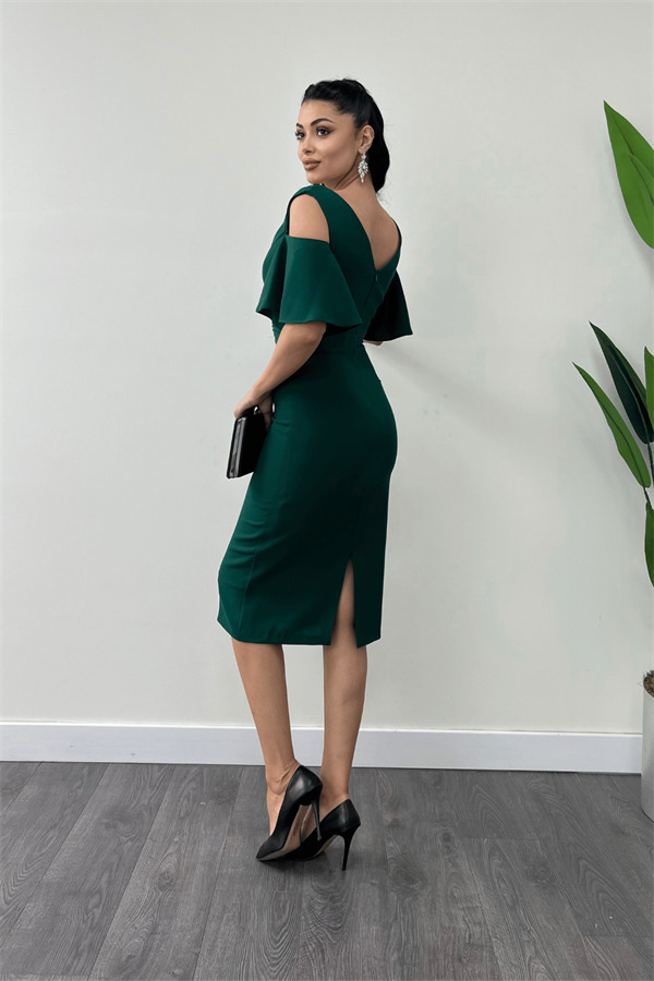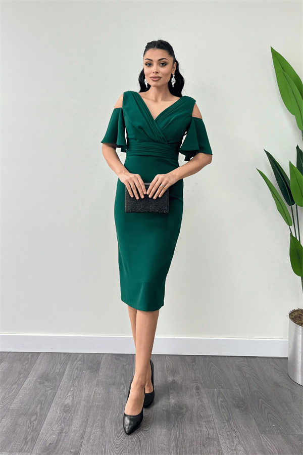 Krep Kumaş Büzgü Detaylı Kalem Elbise - ZÜMRÜT YEŞİL
