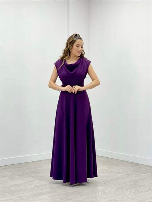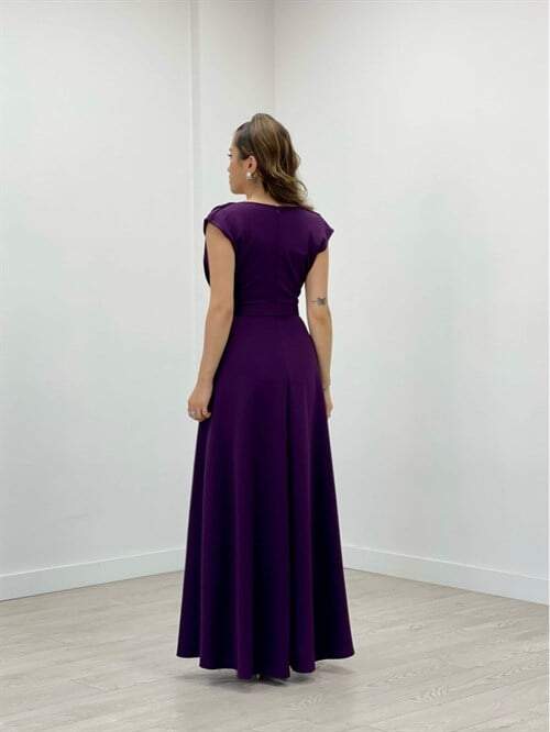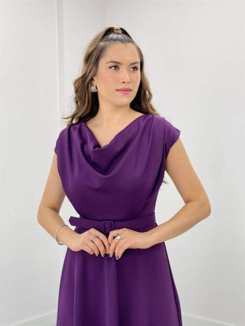 Krep Kumaş Degaje Yaka Elbise - PATLICAN MOR