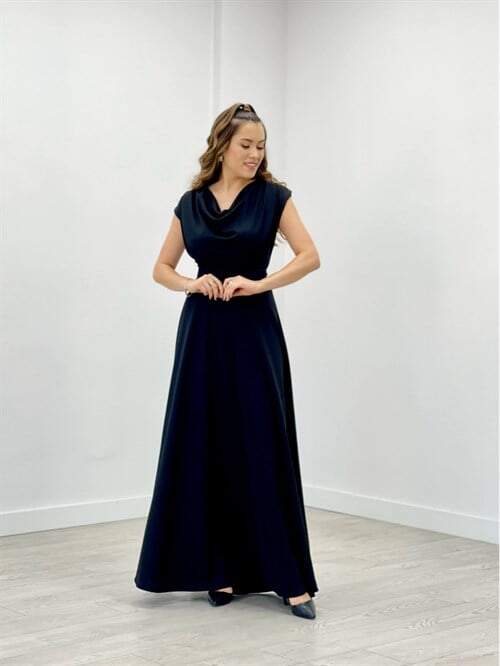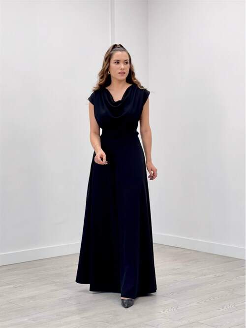 Krep Kumaş Degaje Yaka Elbise - SİYAH