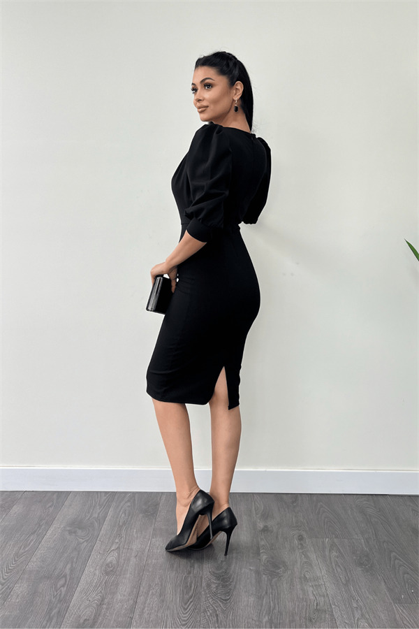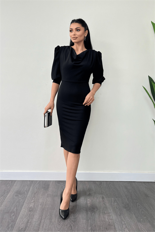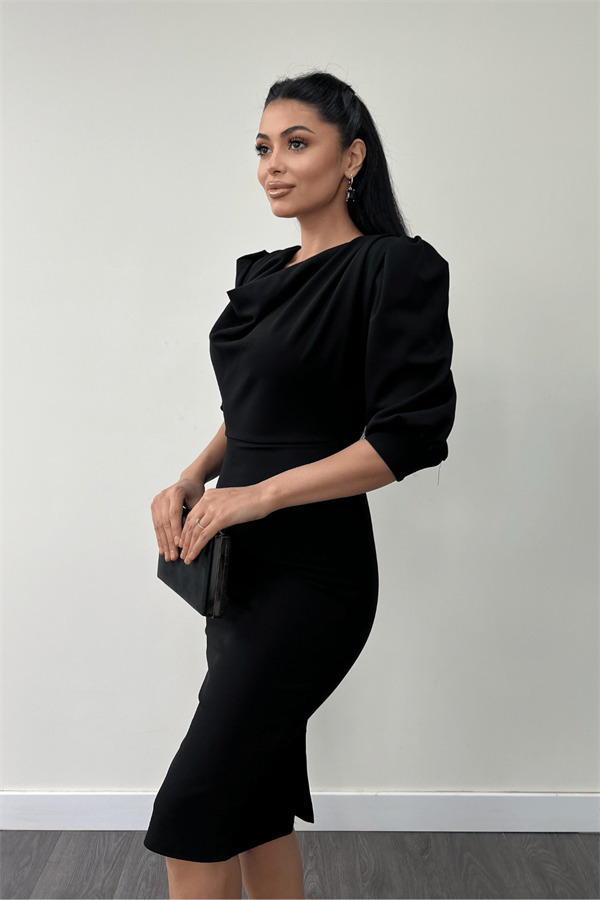 Krep Kumaş Degaje Yaka Kalem Elbise - SİYAH