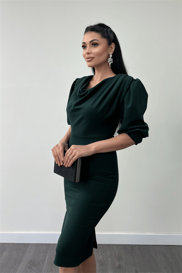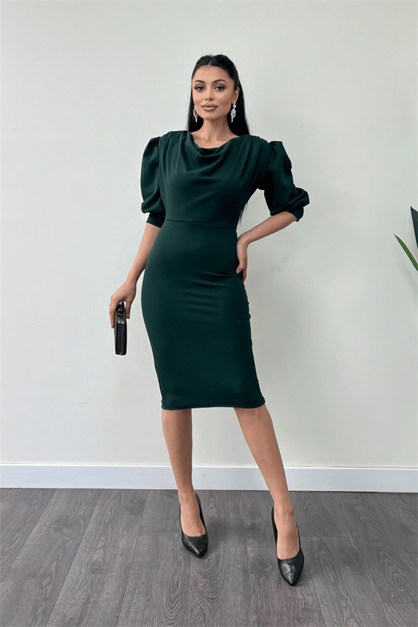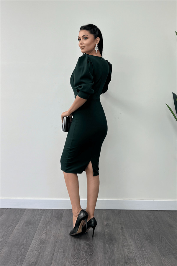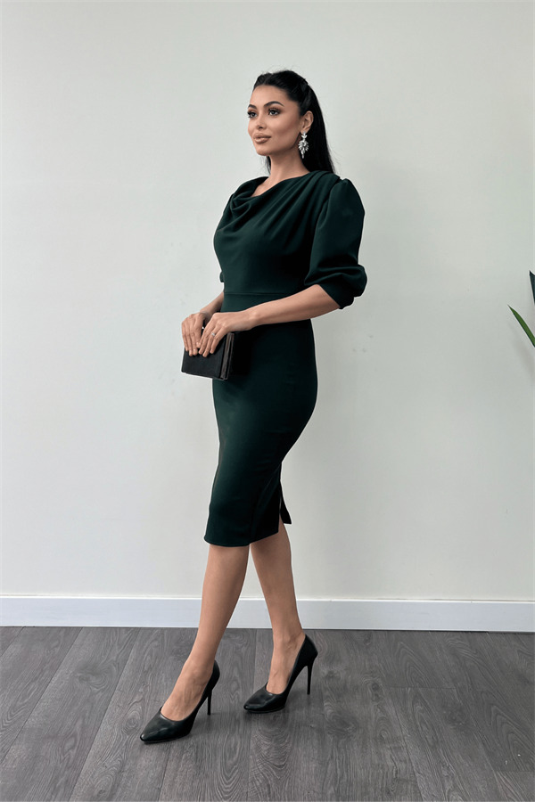 Krep Kumaş Degaje Yaka Kalem Elbise - ZÜMRÜT YEŞİL