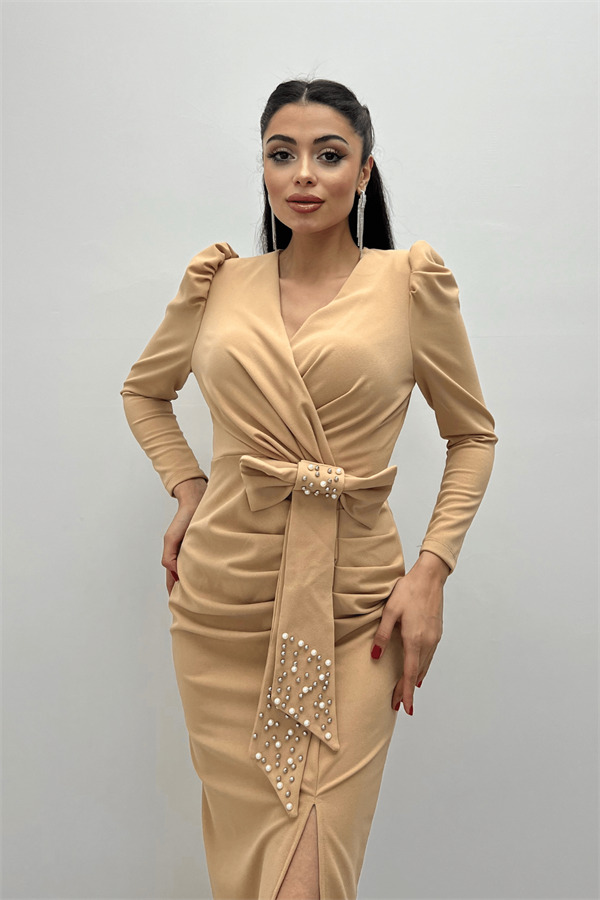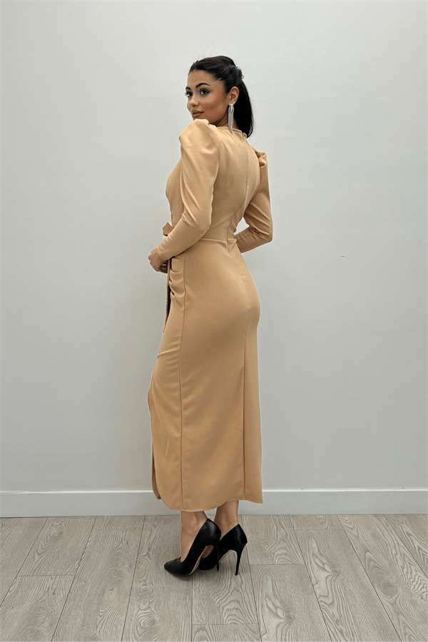 Krep Kumaş İnci Detaylı Ceket Elbise - BEJ