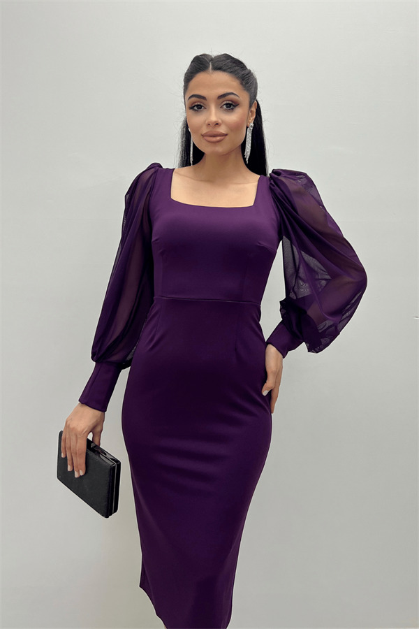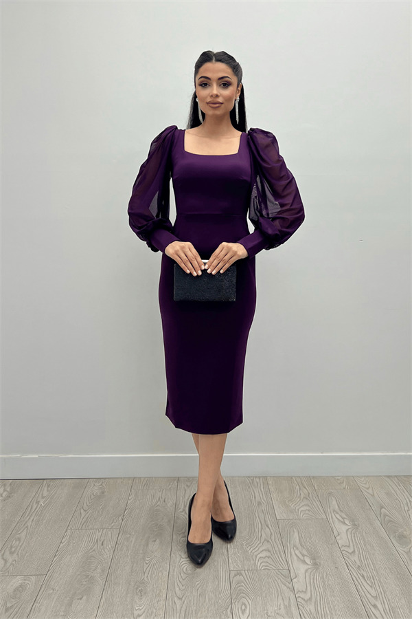 Krep Kumaş Kare Yaka Kalem Elbise - PATLICAN MOR