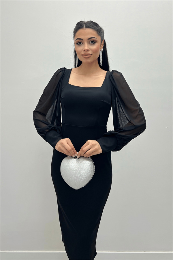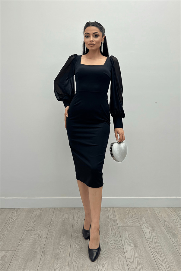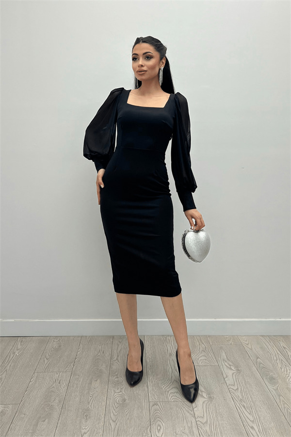 Krep Kumaş Kare Yaka Kalem Elbise - Siyah