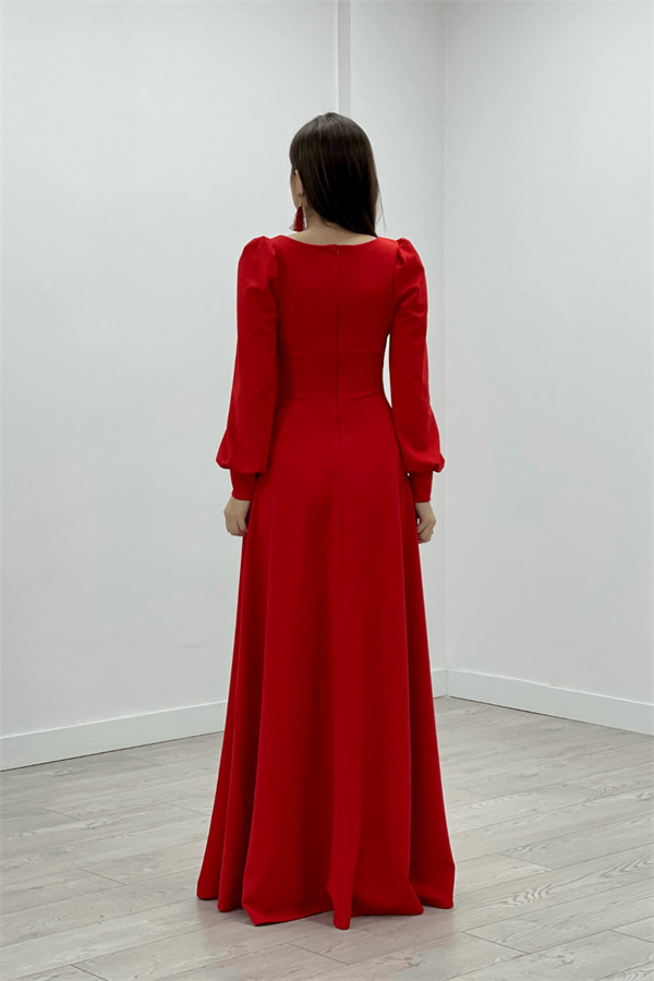 Krep Kumaş Kemer Detaylı Abiye Elbise - KIRMIZI
