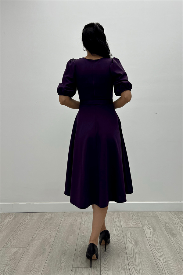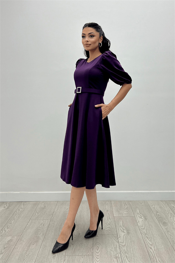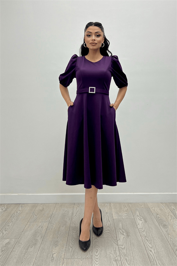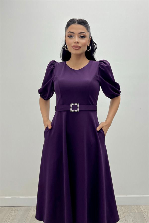 Krep Kumaş Kemer Detaylı Elbise - PATLICAN MOR