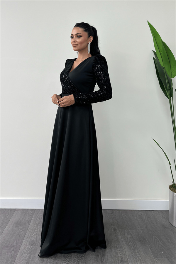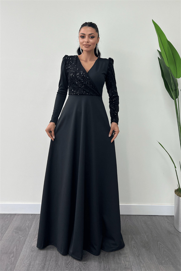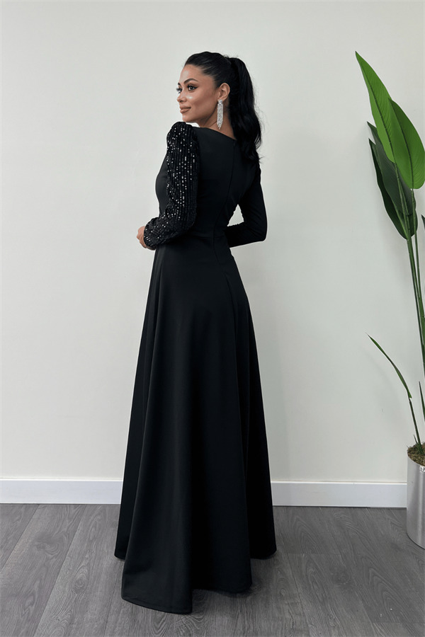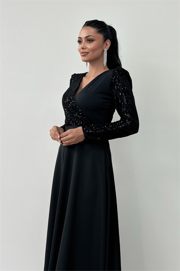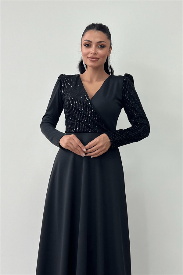 Krep Kumaş Payet Detaylı Elbise - SİYAH