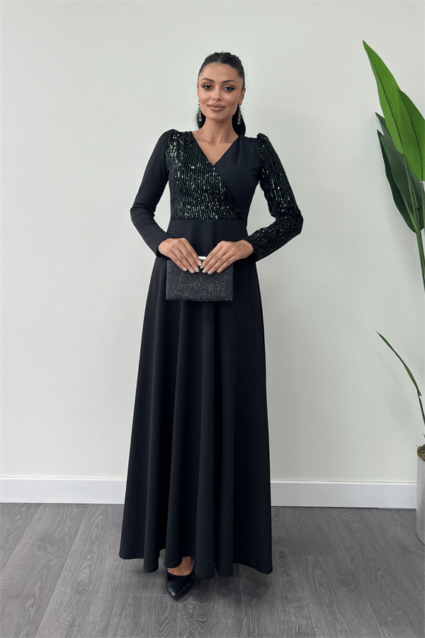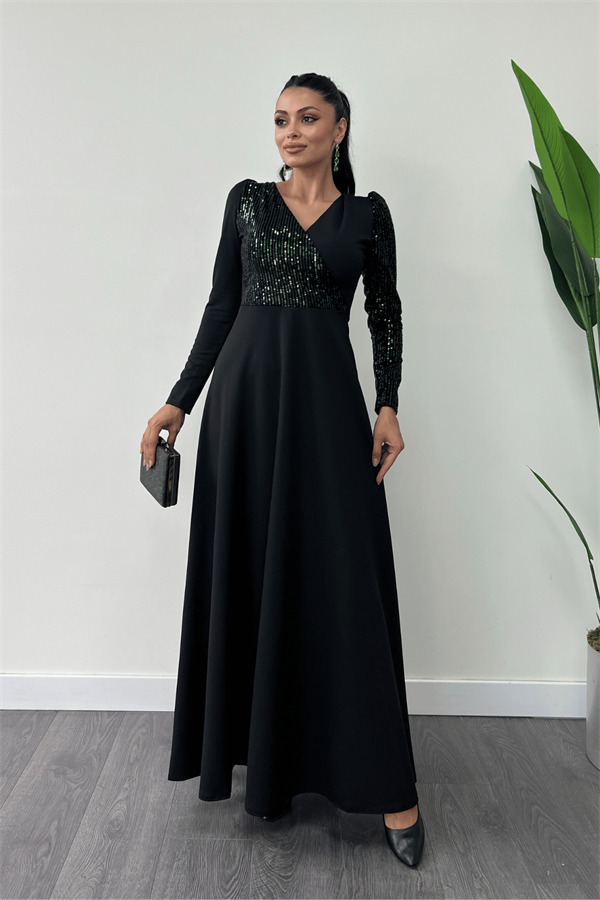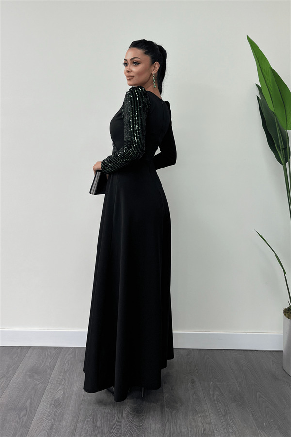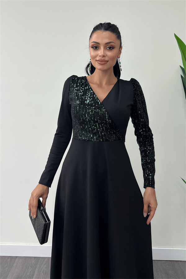 Krep Kumaş Payet Detaylı Elbise - ZÜMRÜT YEŞİL