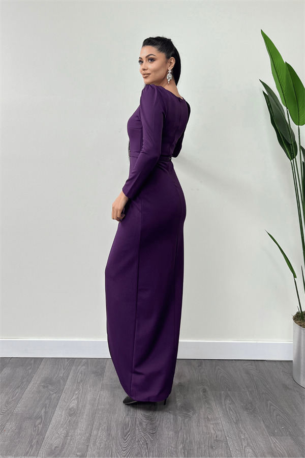 Krep Kumaş Pile Detaylı Elbise - PATLICAN MOR