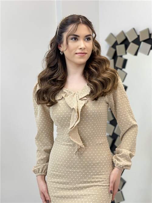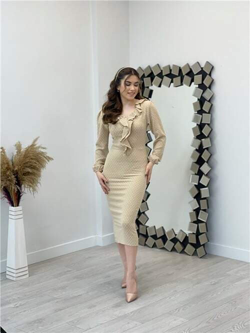 Krep Kumaş Puantiye Detaylı Kalem Elbise - KREM RENGİ