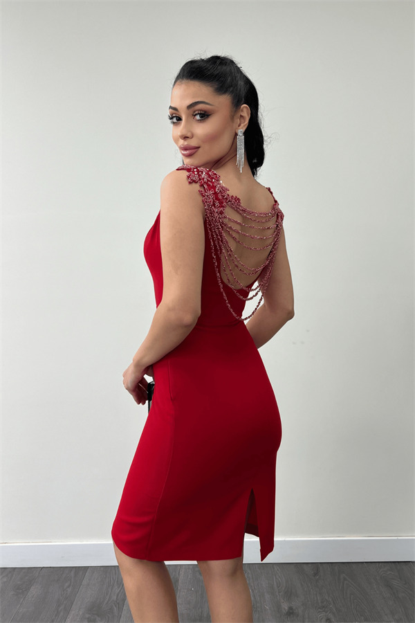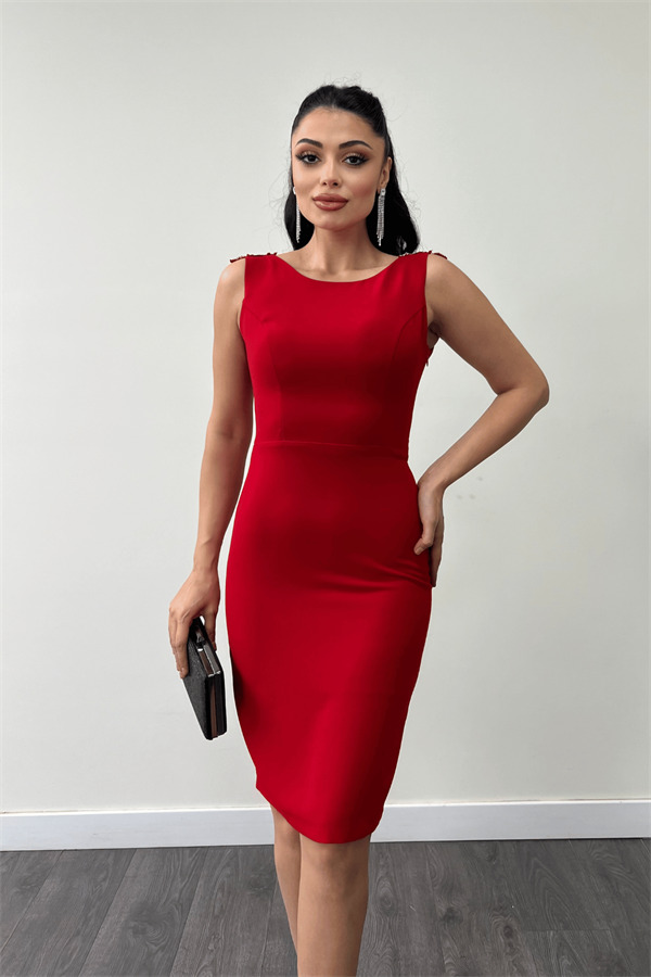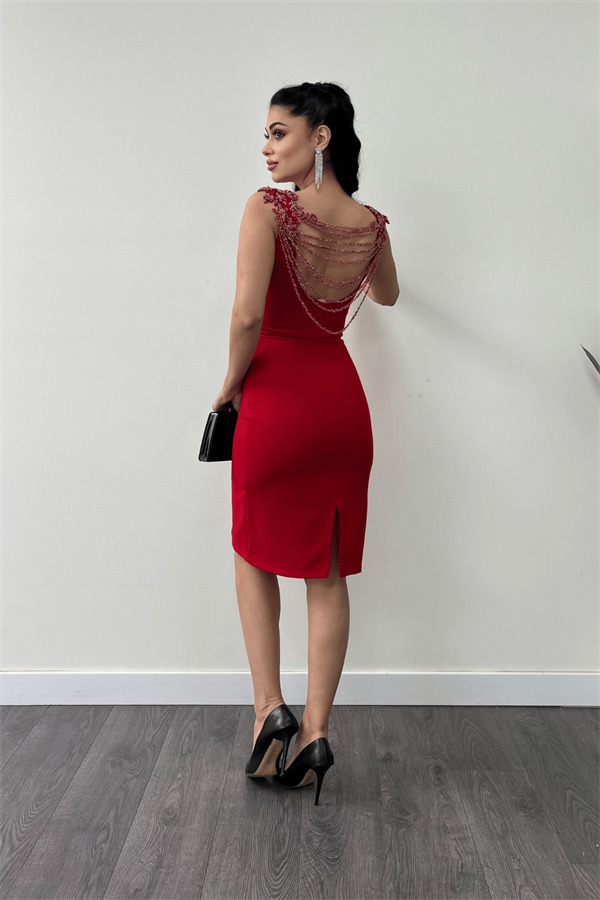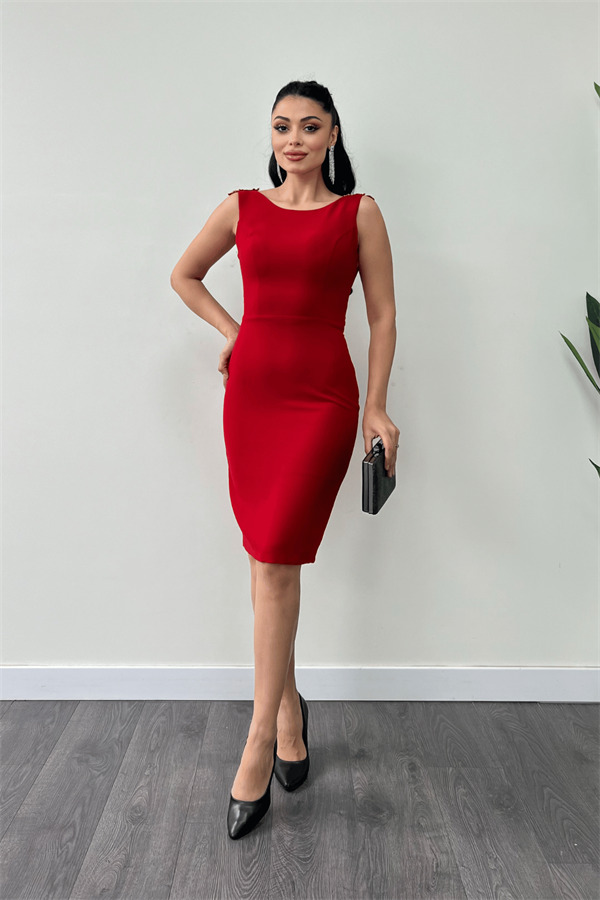 Krep Kumaş Sırt Boncuk Detaylı Kalem Elbise - KIRMIZI