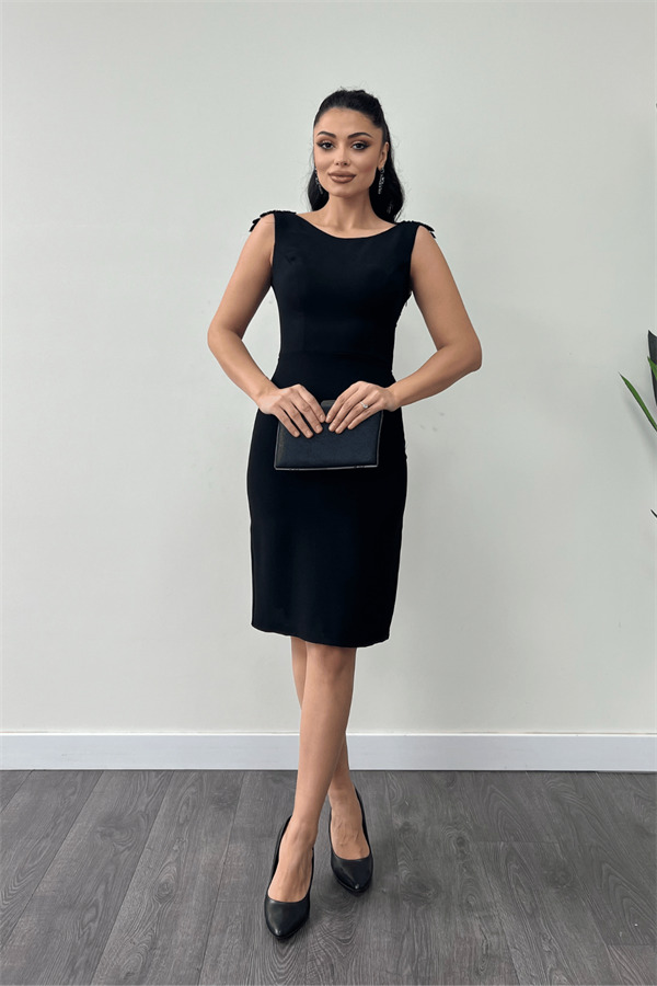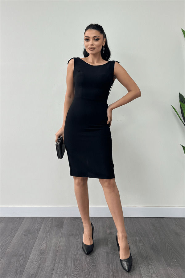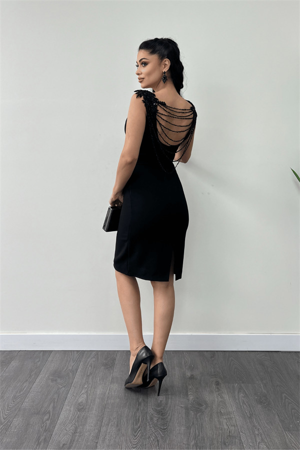 Krep Kumaş Sırt Boncuk Detaylı Kalem Elbise - SİYAH