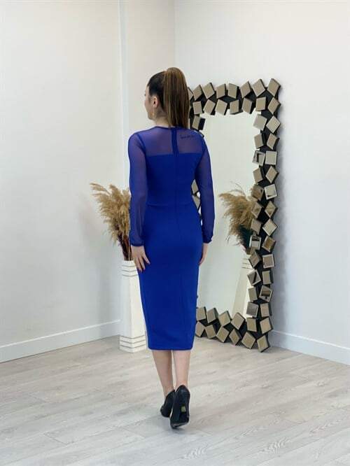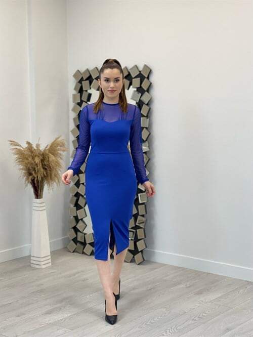 Krep Kumaş Tül Detaylı Kalem Elbise - SAKS MAVİSİ