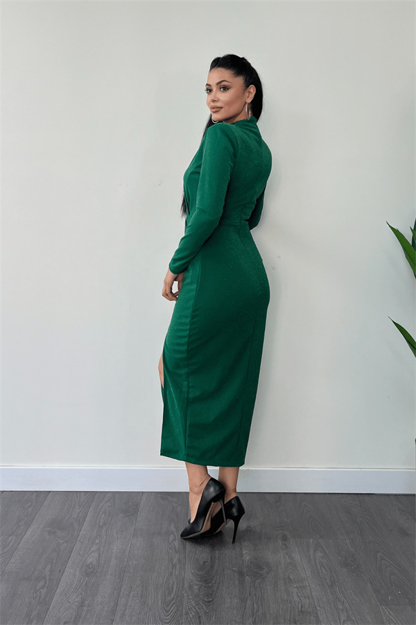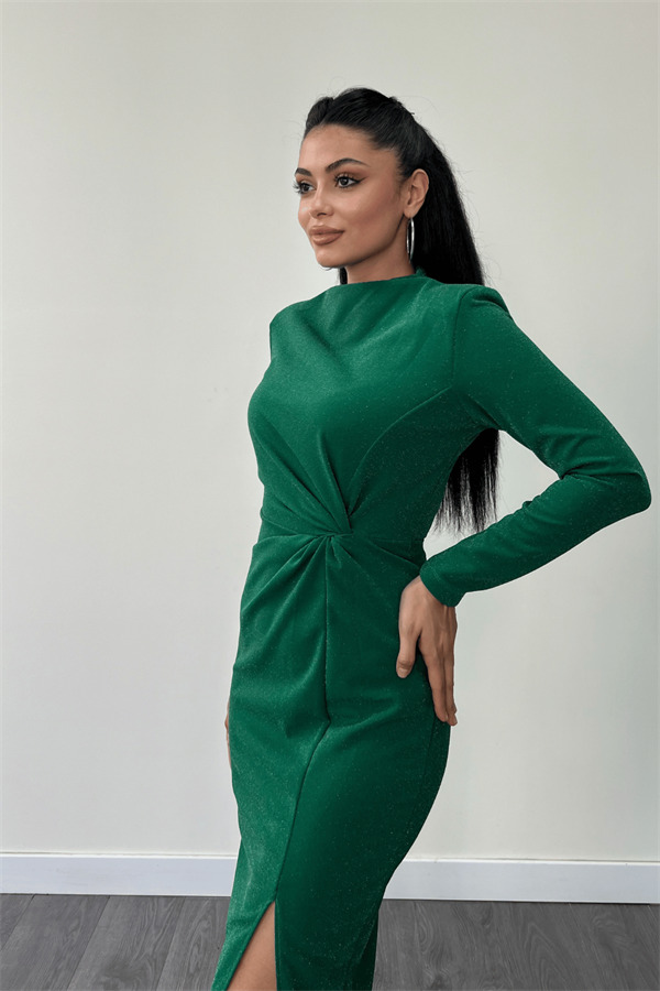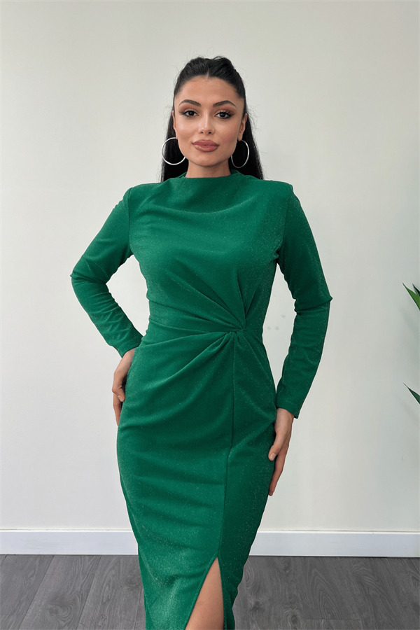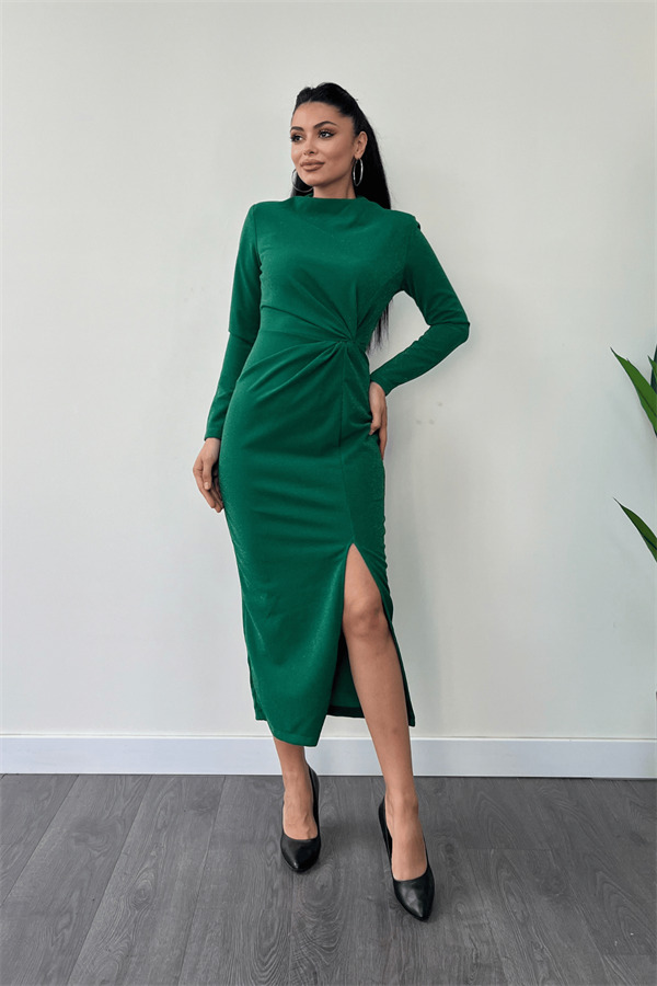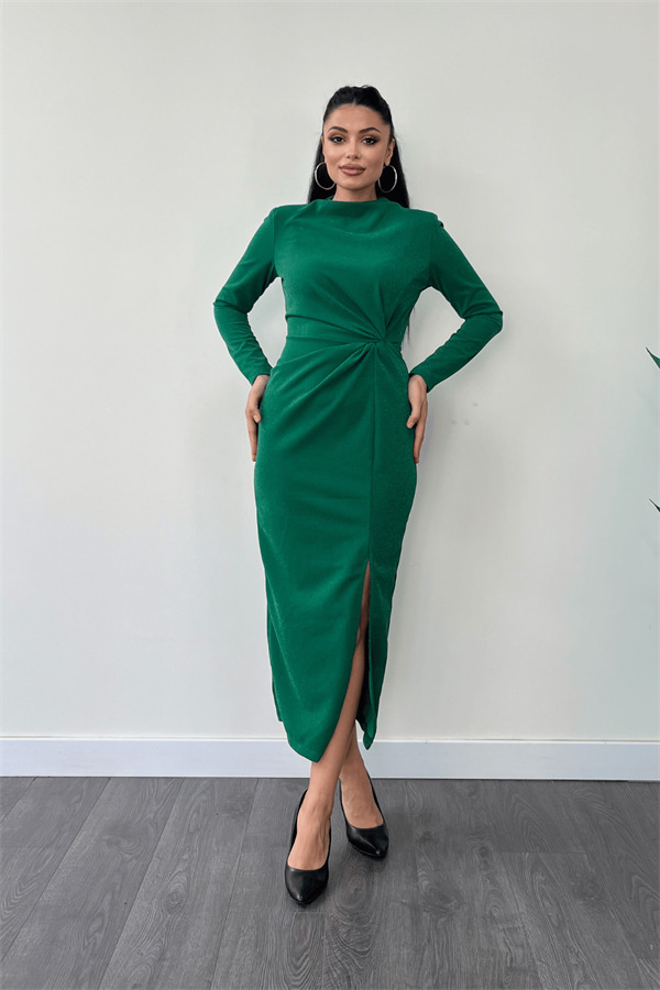 Krep Simli Kumaş Burgu Detaylı Kalem Elbise - ZÜMRÜT YEŞİL