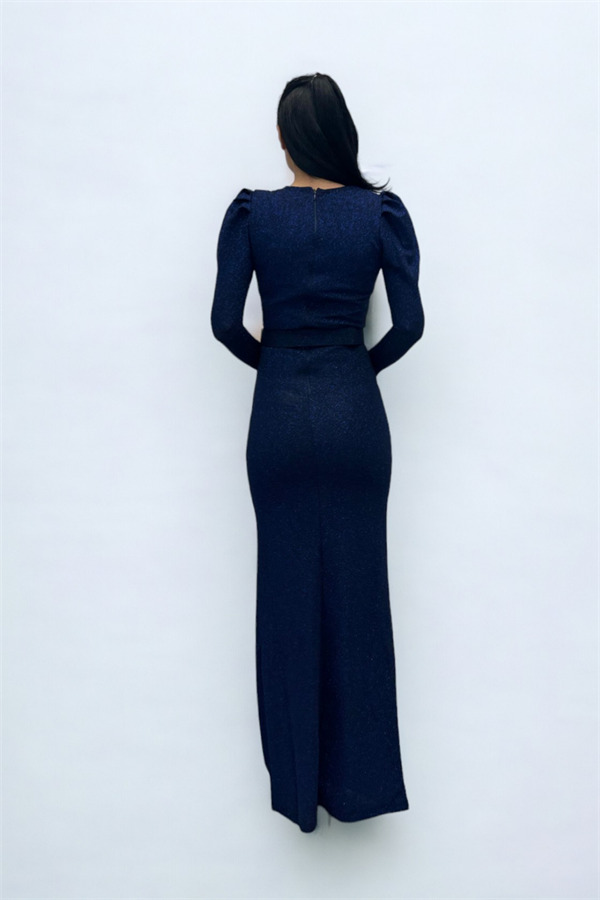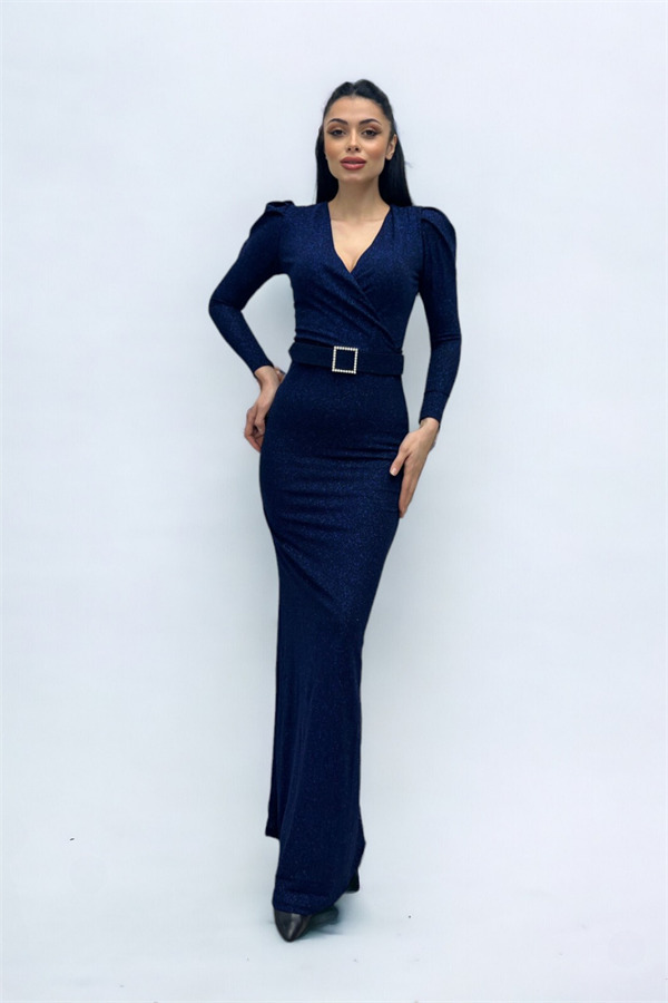 Kruvaze Yaka Kemer Detaylı Elbise - LACİVERT