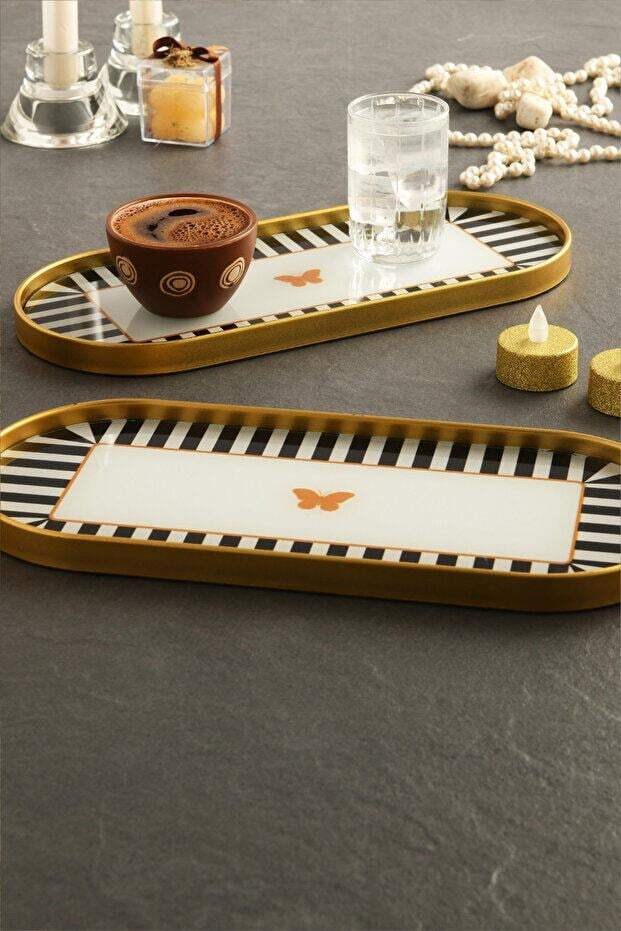 Kelebek Desen Detaylı Cam Sunum Tepsisi Gold 2 Adet 12x30 cm