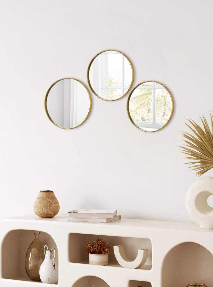 Evinize zarif bir dokunuş katmak istiyorsanız bu altın çerçeveli yuvarlak dekoratif ayna, aradığınız parça! 24 cm çapındaki kompakt formu ve 2 cm kalınlığı ile hem duvar aynası olarak hem de konsol, makyaj masası ya da giriş dekorasyonunda masa üstü ayna olarak kullanılabilir.