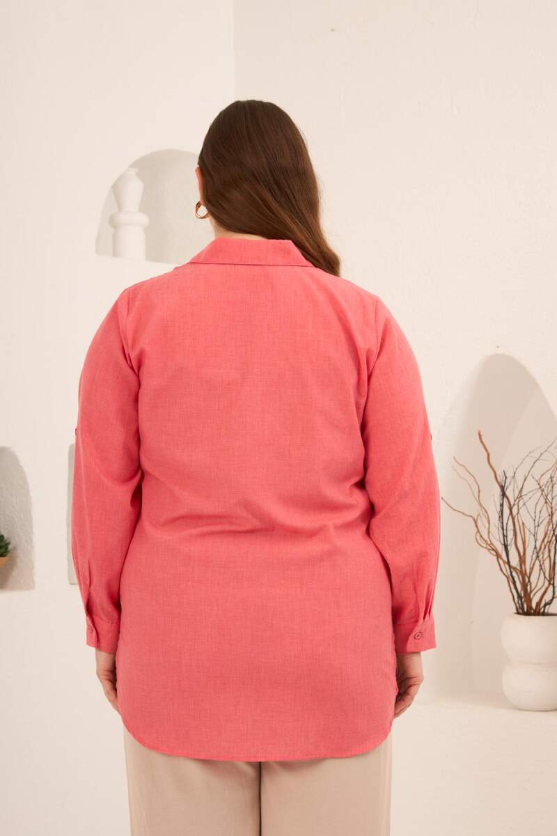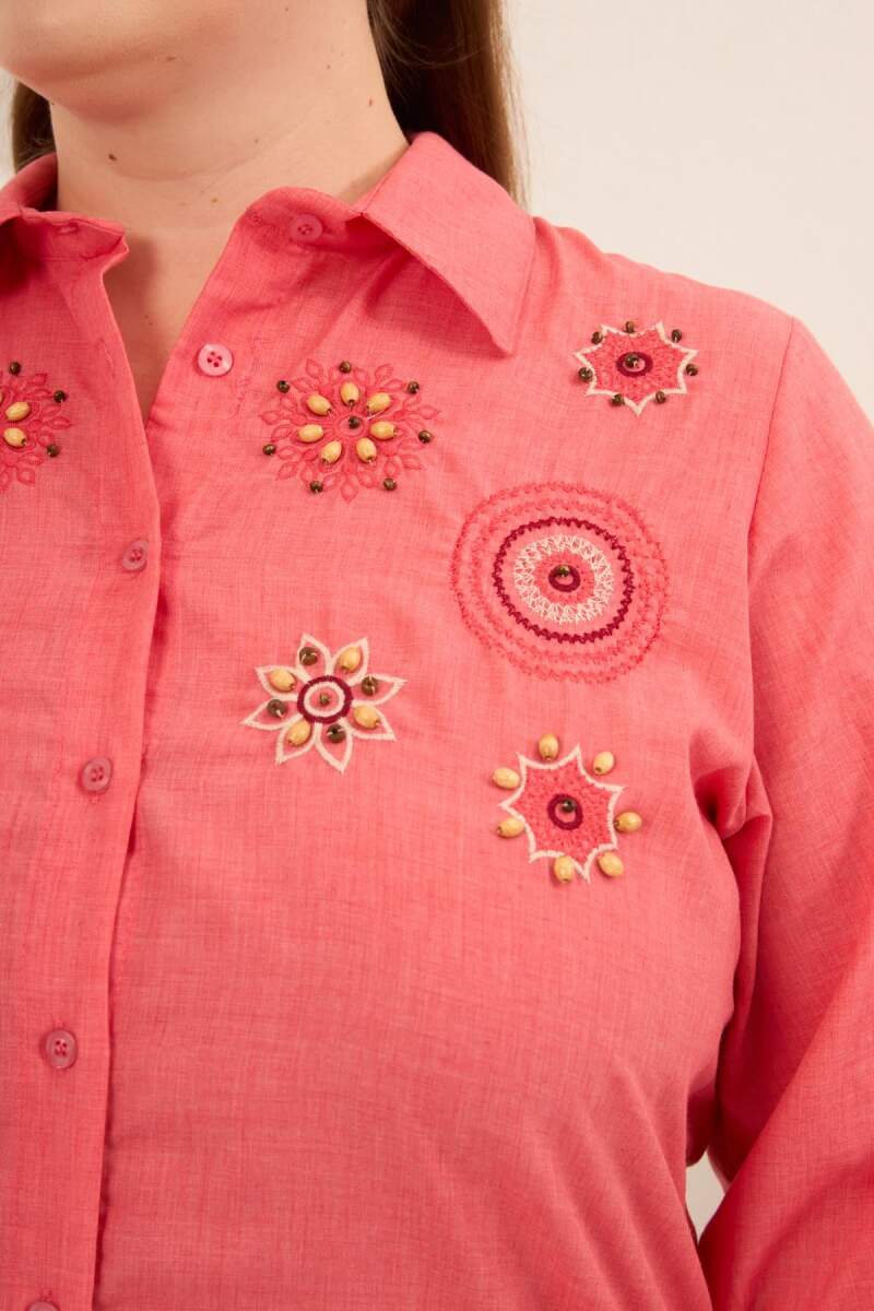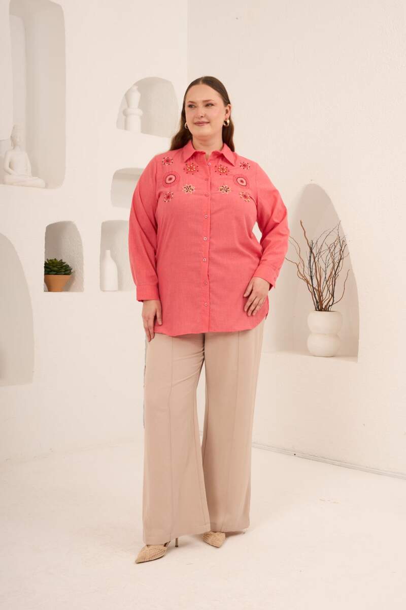 Nakış ve İşleme Detaylı Büyük Beden Gömlek Mercan