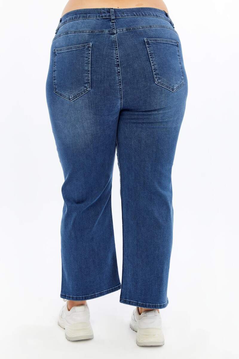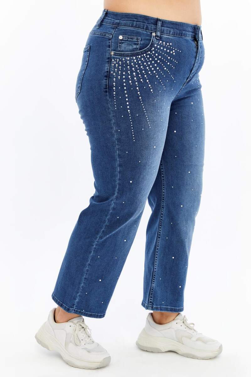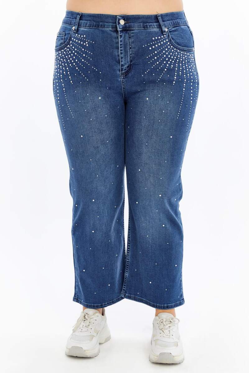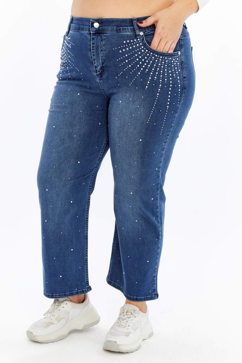 Modern tasarımıyla dikkat çeken büyük beden taş detaylı denim pantolon, mavi rengiyle yaz kombinlerinize ferahlık katıyor.