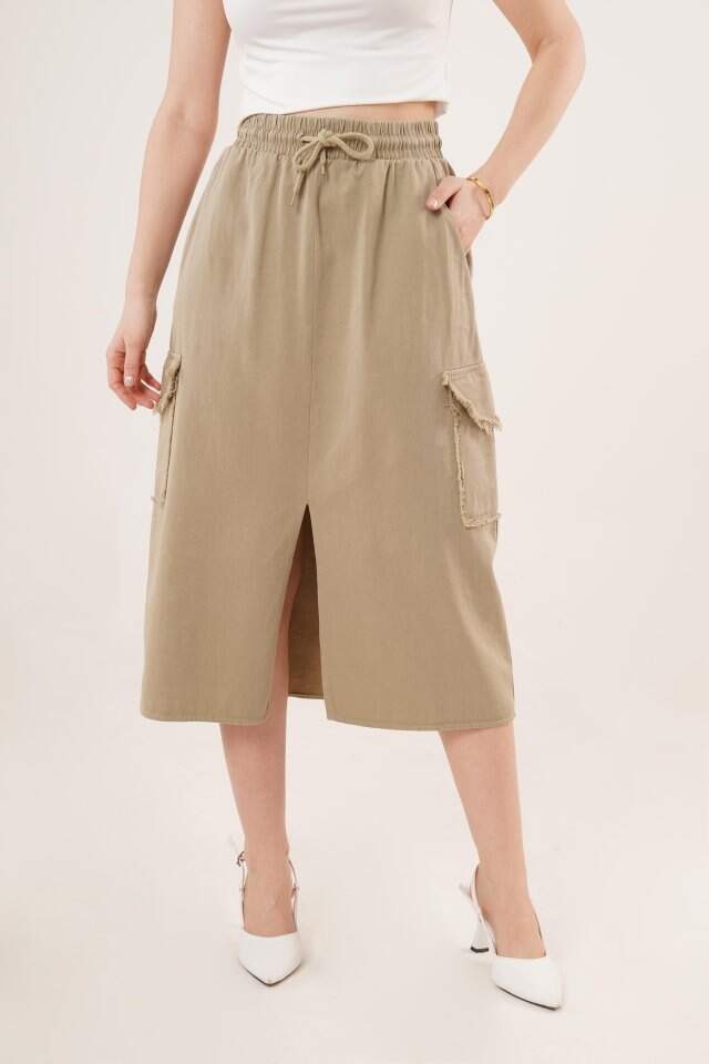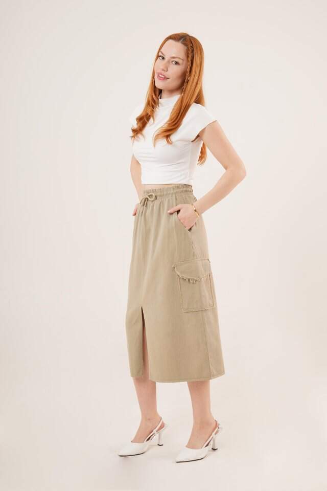 Ön Yırtmaçlı Cep Detaylı Haki Etek