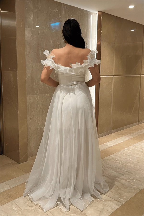 Organze Şifon Kumaş Volan Detaylı Abiye Elbise - BEYAZ
