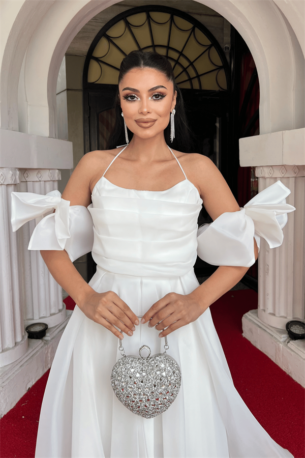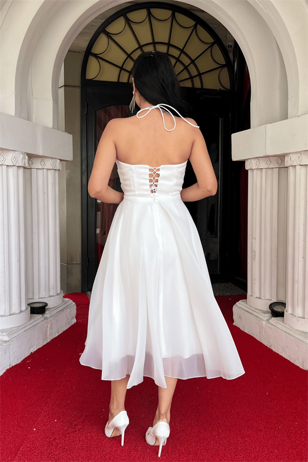 Organze Tül Kumaş Sırt Detaylı Midi Elbise - BEYAZ
